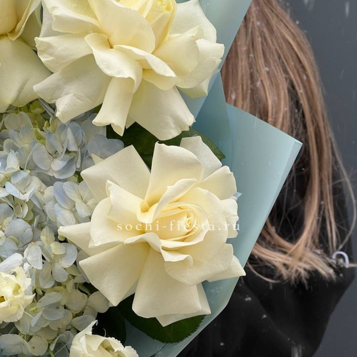 Букет с гортензией и белыми французскими розами