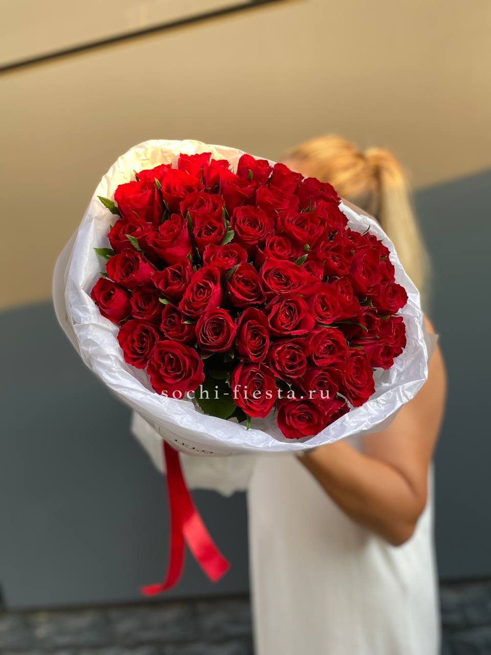 Пятьдесят одна роза насыщенного красного оттенка собрана в плотную композицию. Упаковка мягко обрамляет бутоны, сохраняя естественную форму и создавая цельный силуэт.