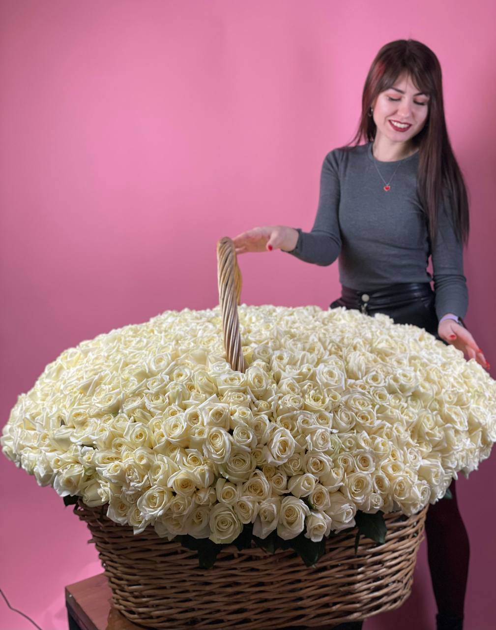 Триста тридцать три розы уложены в корзину и образуют плотную цветочную поверхность. Объём композиции притягивает внимание и создаёт ощущение праздничного изобилия.