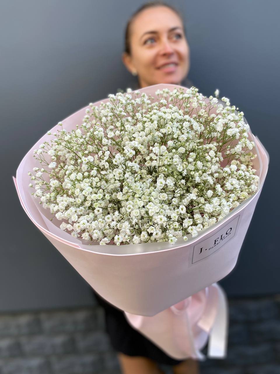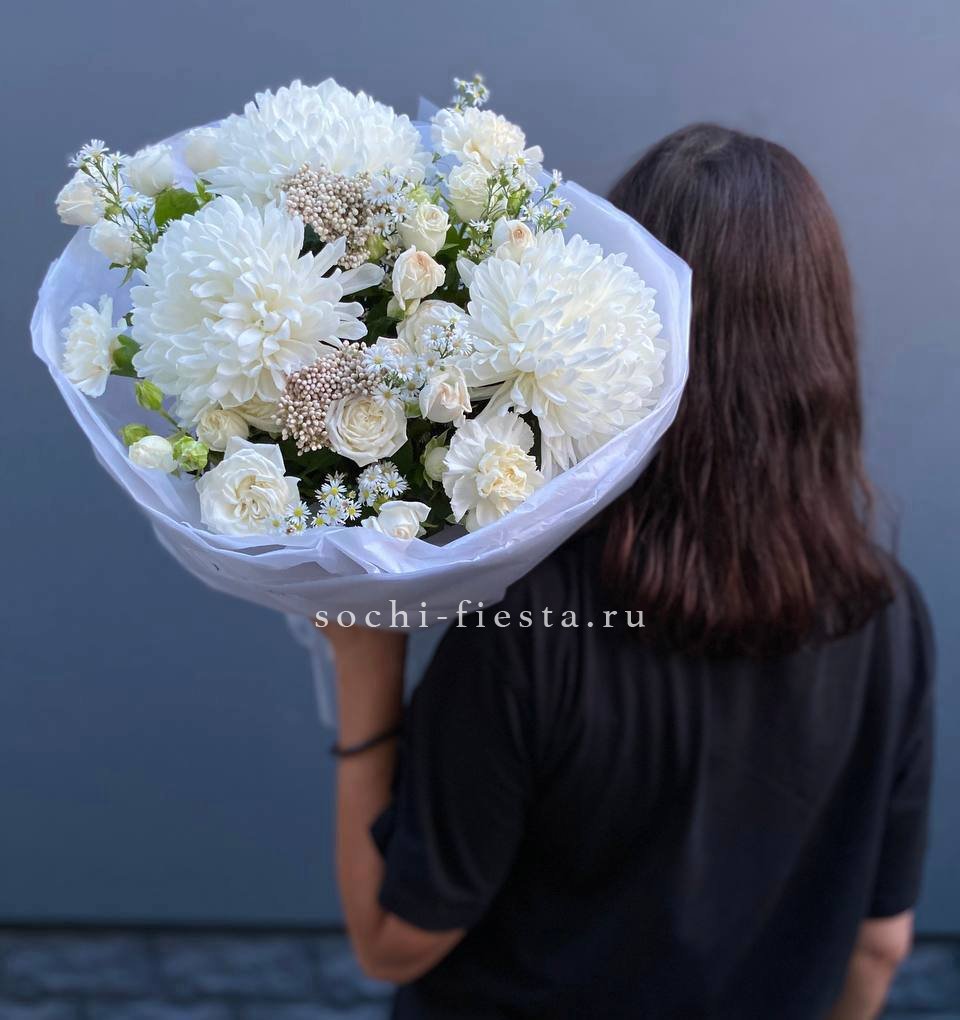 Белоснежные шапки кустовой хризантемы собраны в пышный монобукет, который наполняет пространство свежестью и создает праздничное настроение на любом событии.