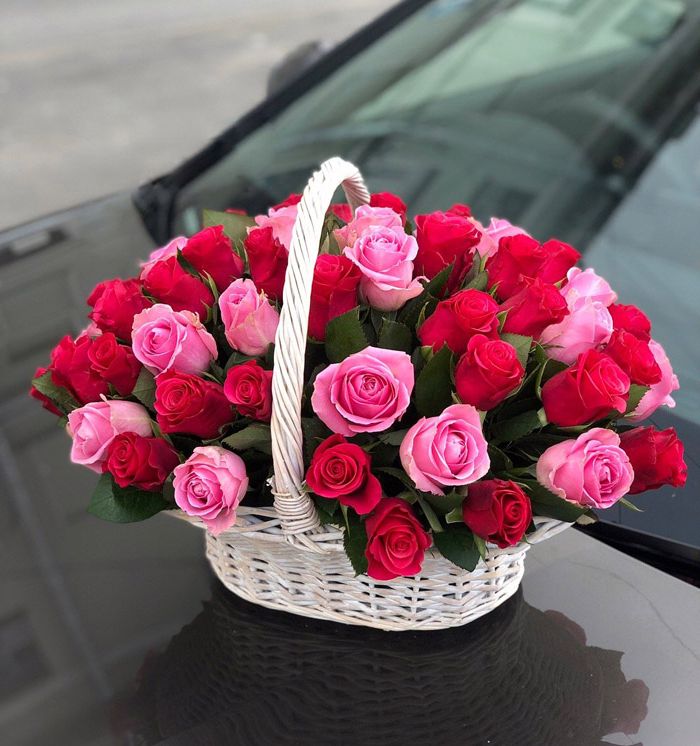 Пятьдесят один цветок в плетеной корзине дополнен серебристым эвкалиптом. Ветки зелени обрамляют каждый бутон и добавляют воздуха между головками роз. Устойчивая форма удобна для размещения на столе.