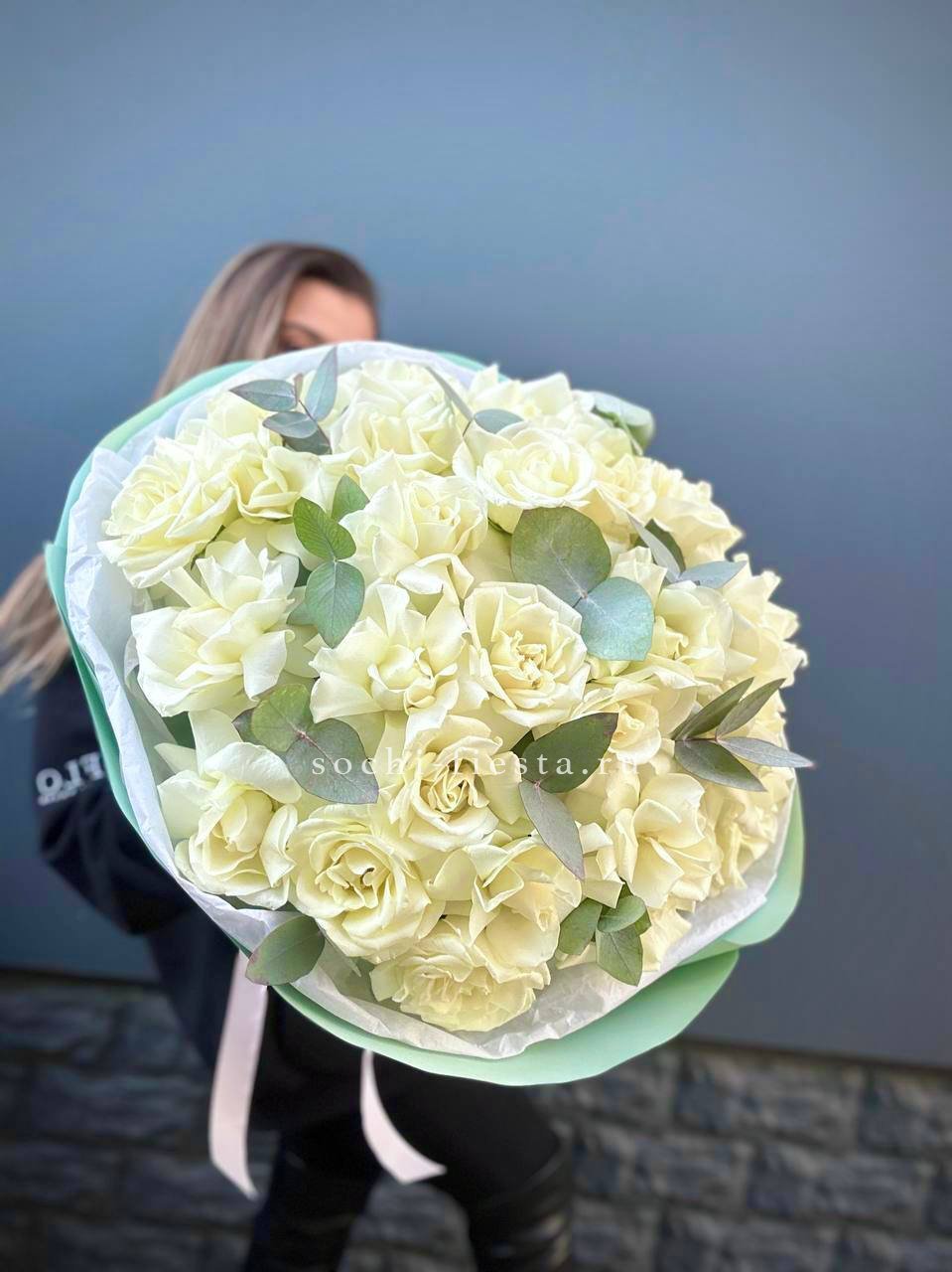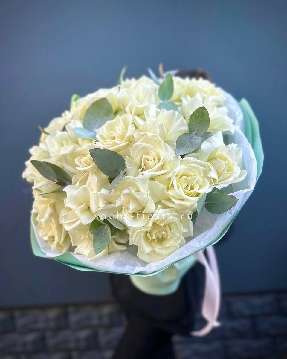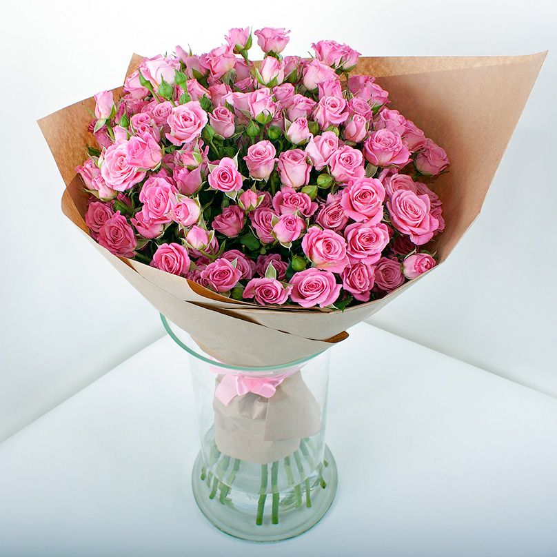 пионовидная кустовая кустовая роза Мисти Баблс, статица, лента, дизайнерская упаковка.