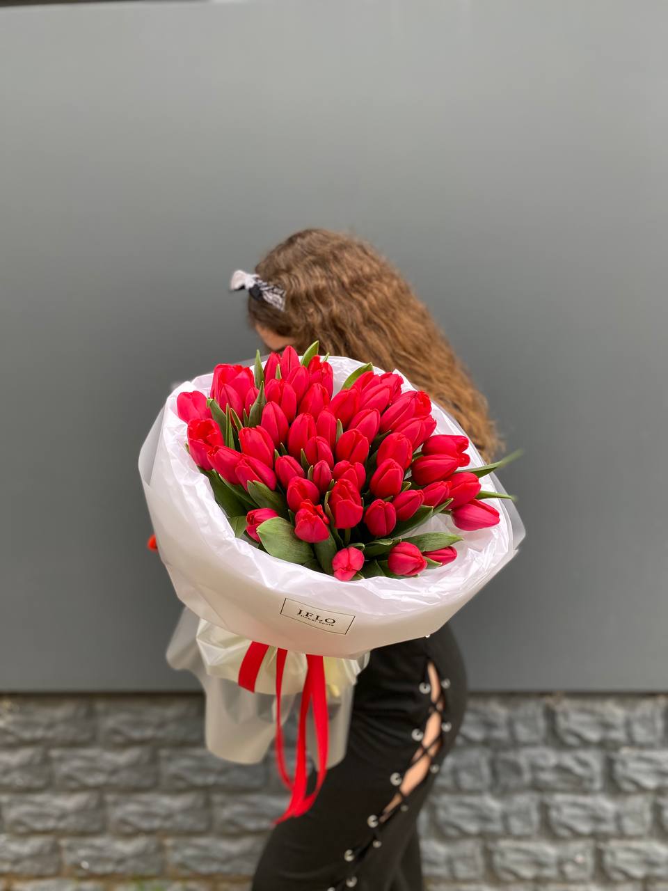 Яркая волна из 51 красного тюльпана в лаконичной упаковке. Плотная сборка создает насыщенное цветовое пятно, которое преображает пространство одним движением. Весенняя энергия в максимальной концентрации.