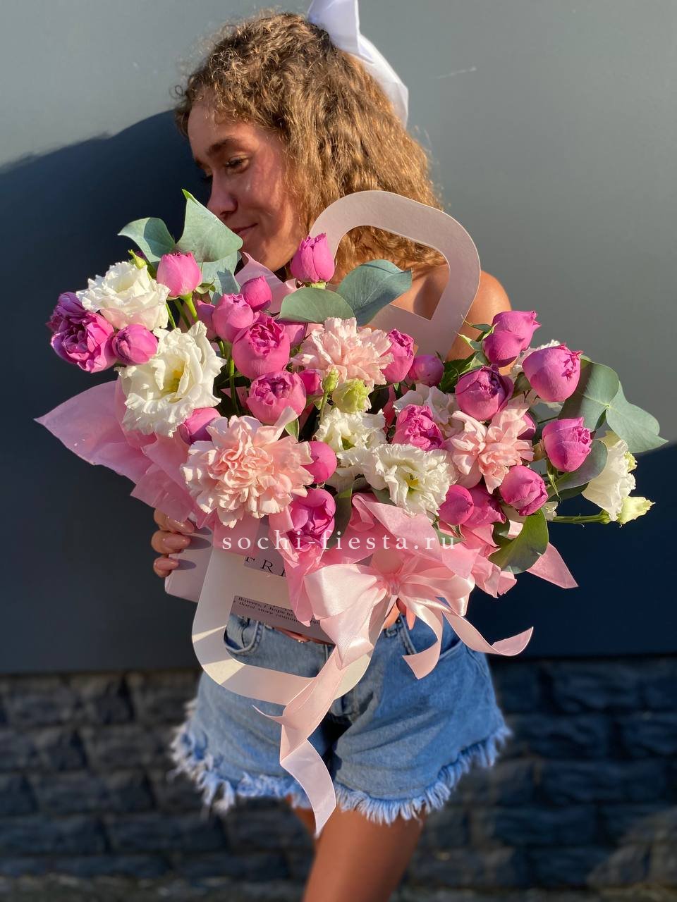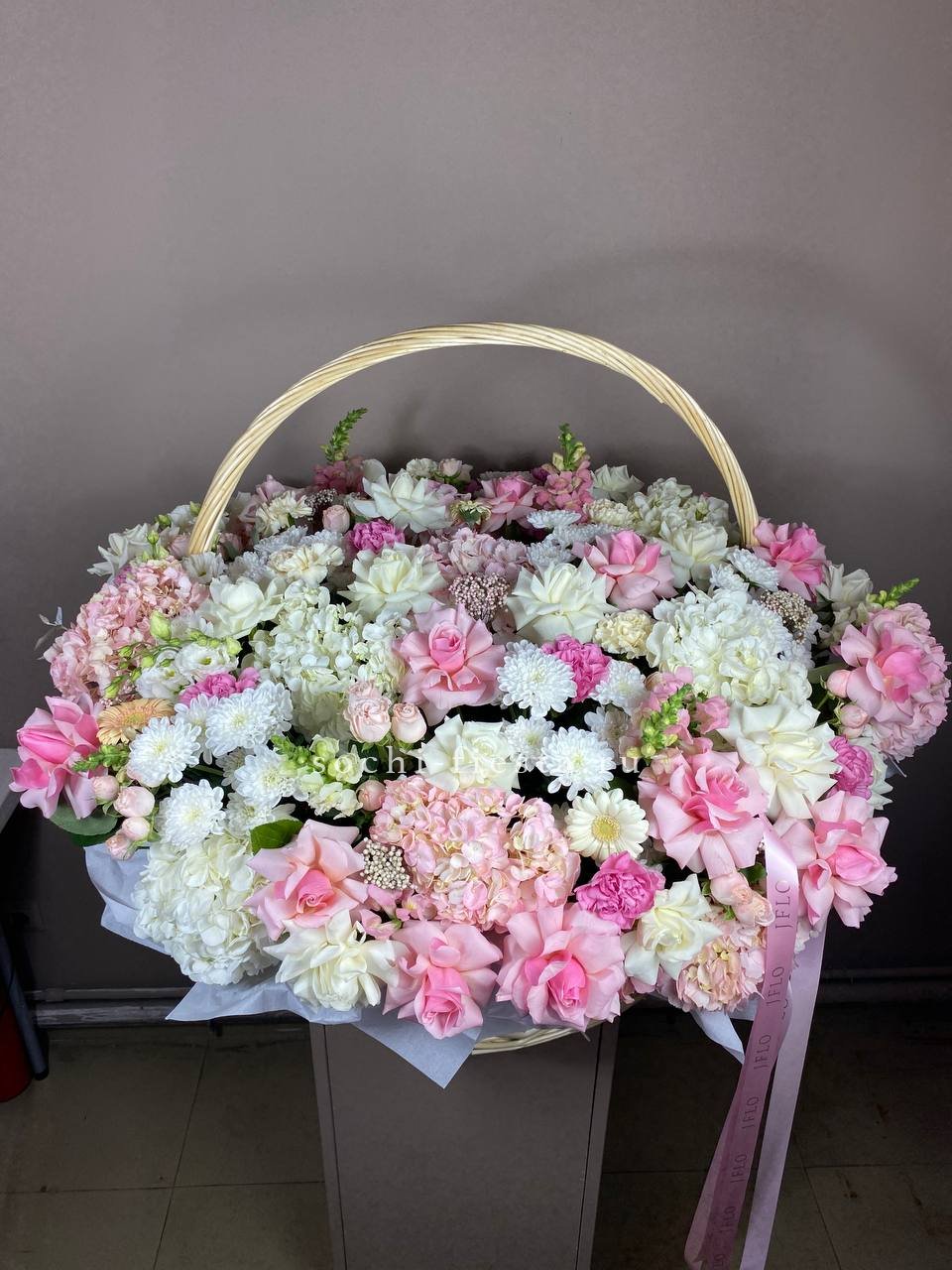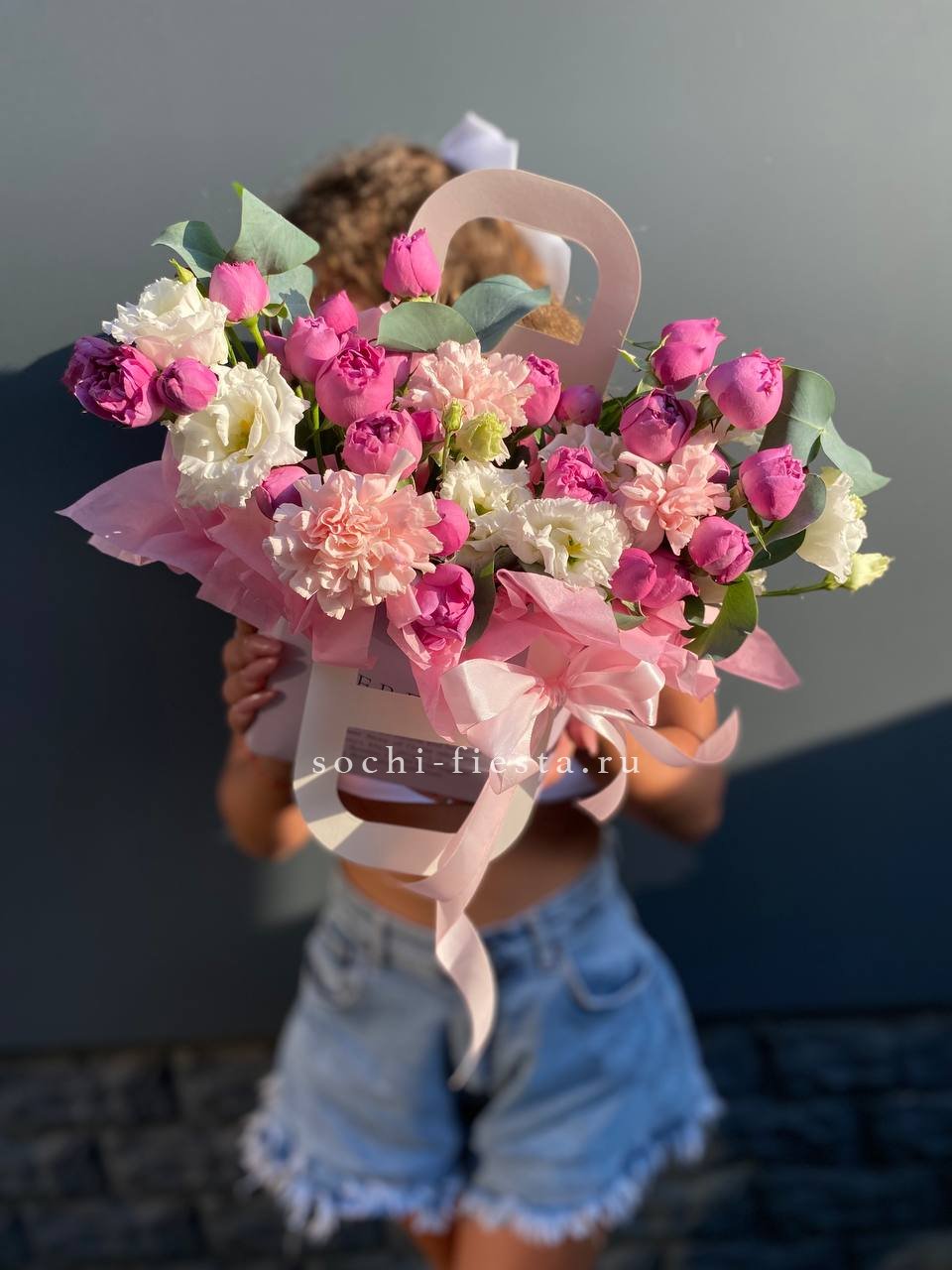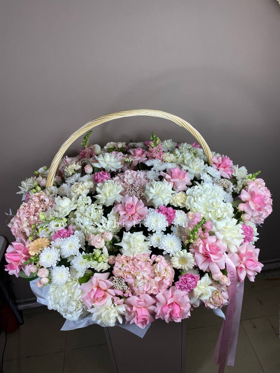гортензия, розовые розы, пионовидные розы, диантус, эвкалипт, лента, сумка-кашпо.