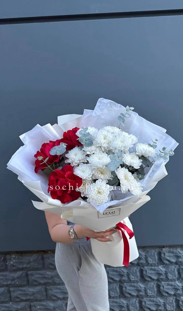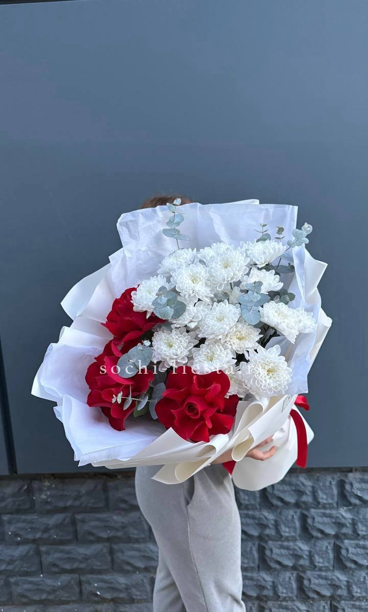 Одиннадцать вывернутых бутонов WhiteNice раскрываются волнами лепестков с матовым свечением. Эвкалипт добавляет воздуха между соцветиями.