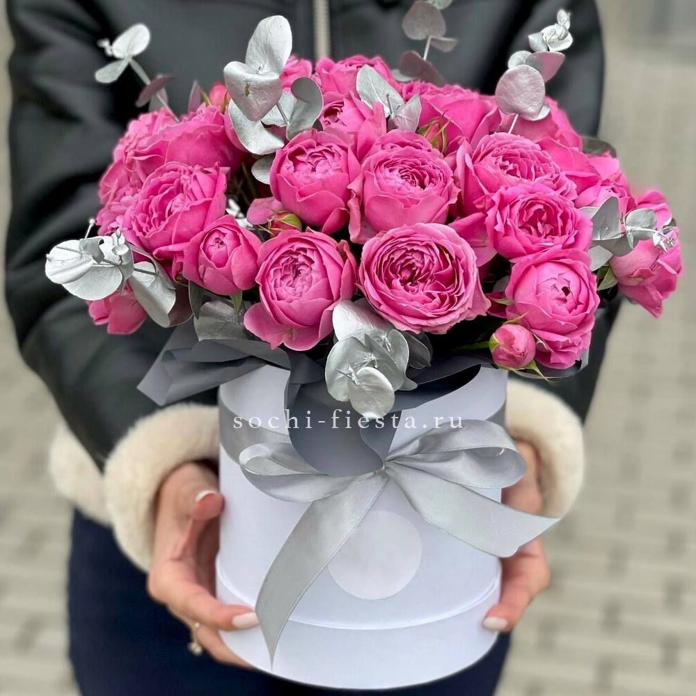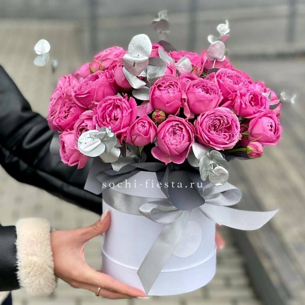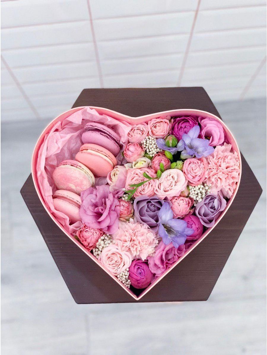 эустома, розы, кустовые розы, диантусы, эустома, озотамнус, макаронс- 6шт., коробка.