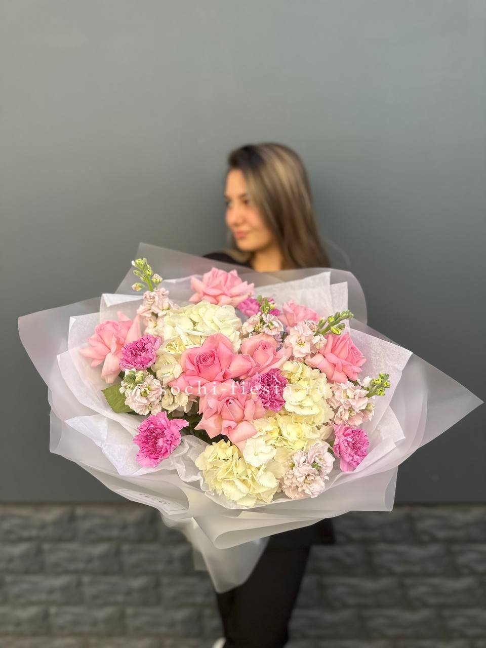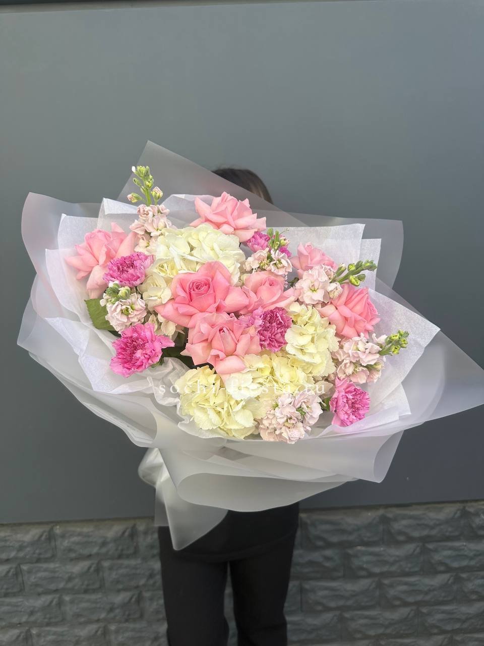 маттиола, розовые розы, гортензии, диантусы, лента и дизайнерская пленка.