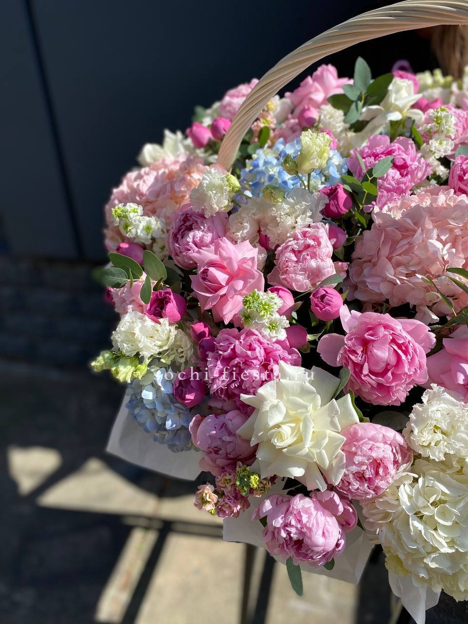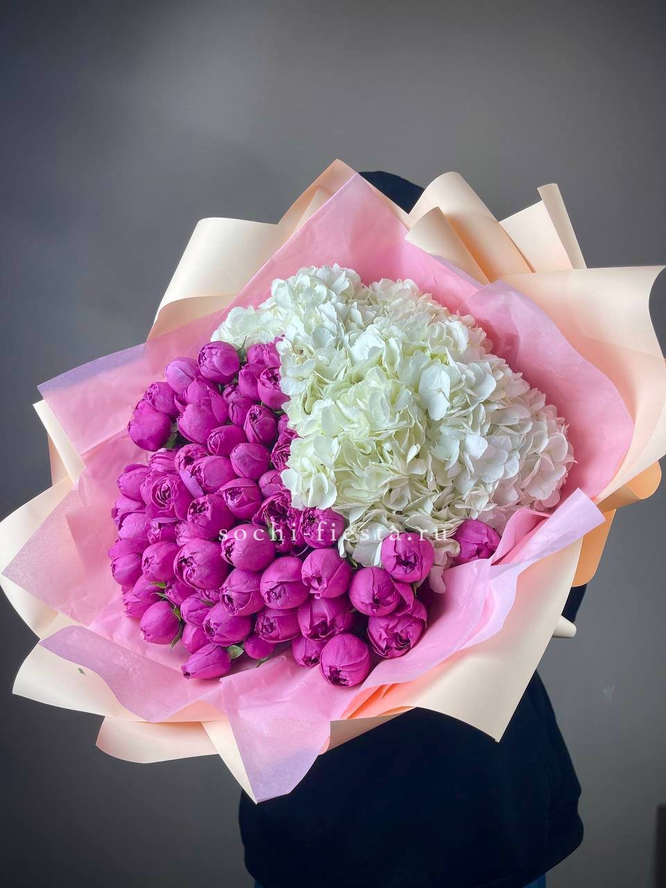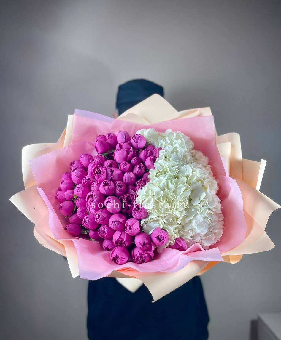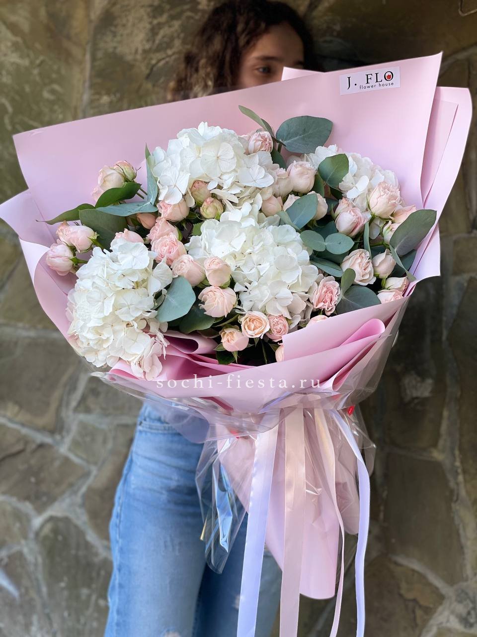 Сочетание пышной голубой гортензии и классических белых роз — это гимн нежности и чистоты. Букет, который не просто удивляет своим масштабом, но и дарит ощущение безмятежности. Идеальный выбор для самого искреннего признания.