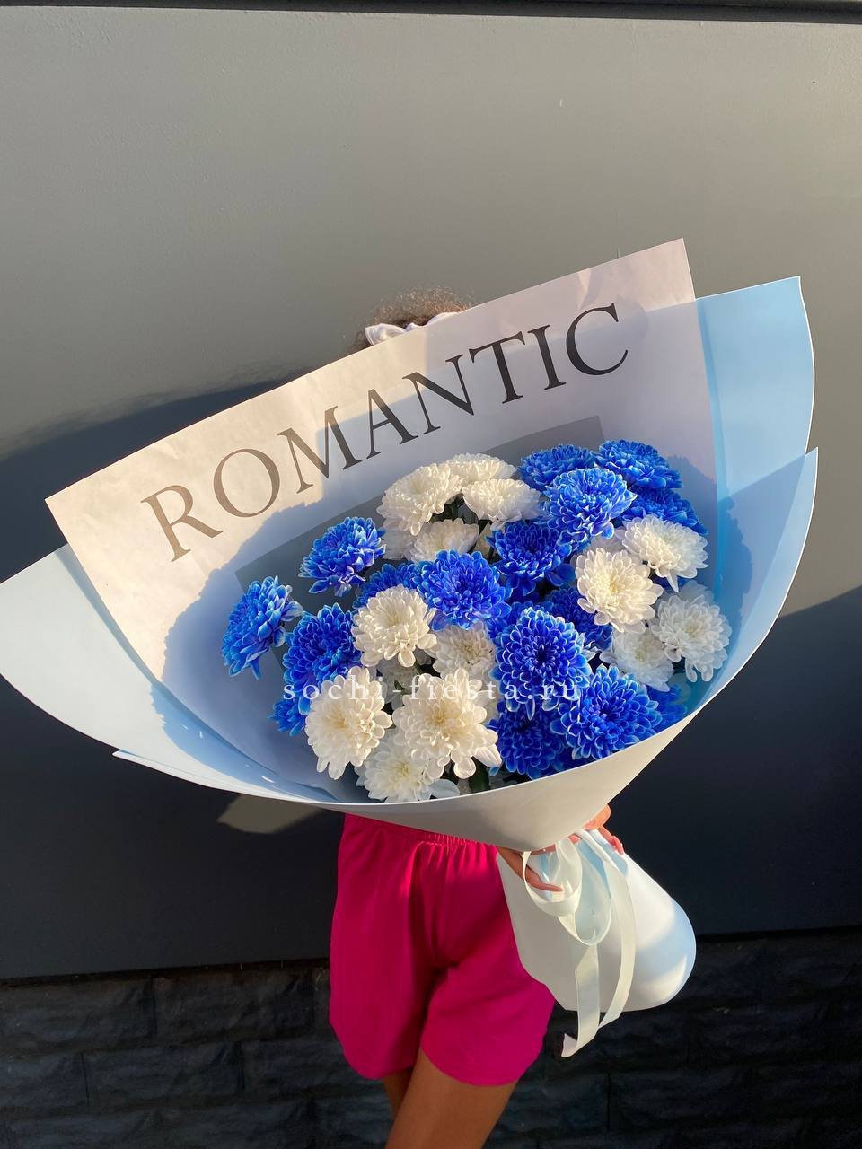 Девять веток кустовой хризантемы в синих оттенках собраны в плотный букет с лаконичной упаковкой. Насыщенный цвет и компактная форма создают яркое визуальное пятно в любом интерьере.