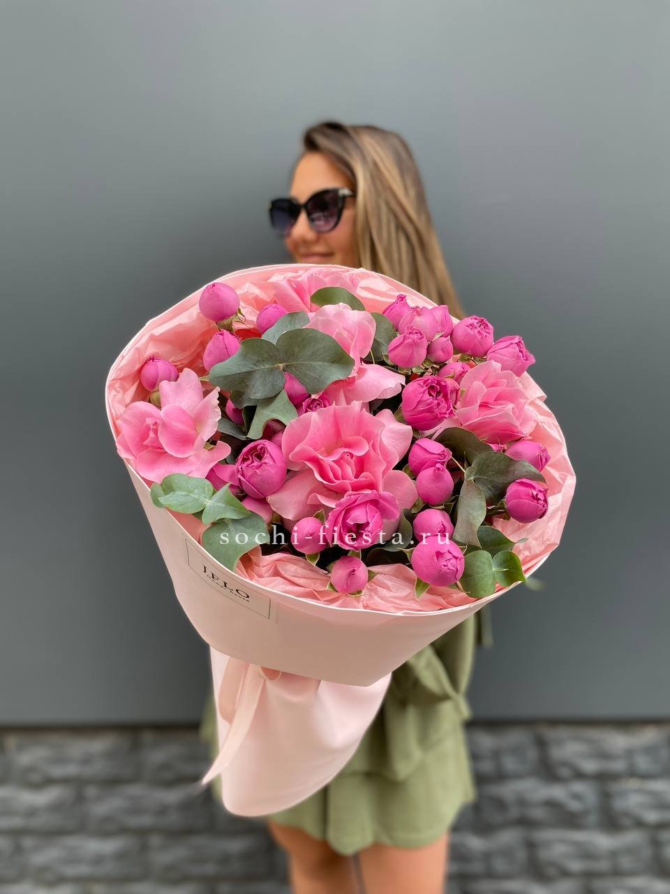 пионовидные розы, розовые розы, эвкалипт, лента, дизайнерская упаковка.
