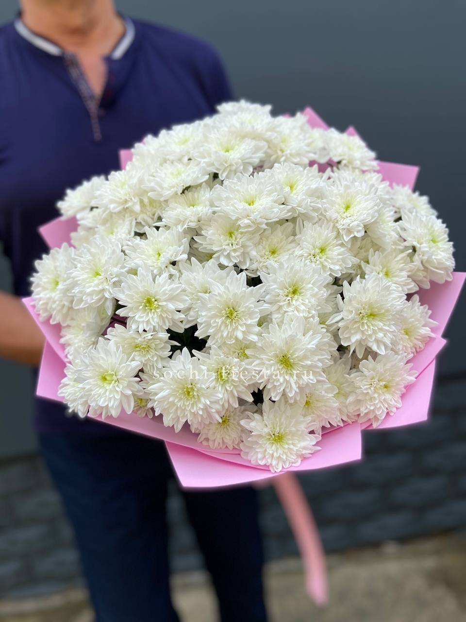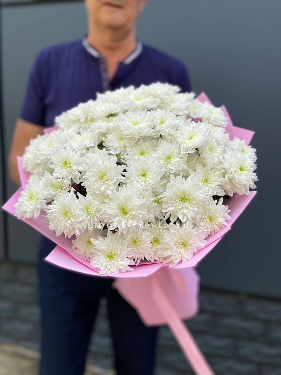 Монохромная композиция из белоснежных эустом в количестве пятидесяти одной штуки. Масштабная сборка впечатляет чистотой линий и графичным присутствием в пространстве.