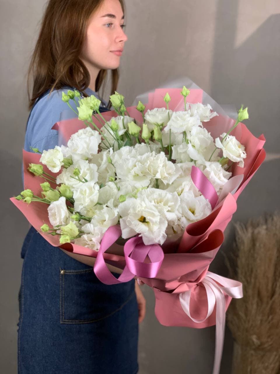 Охапка эустомы в свободной упаковке – чистая форма без усложнений. Веточки располагаются свободно, создавая лёгкий ритм и воздушное присутствие. Монобукет для современного интерьера и минималистичной эстетики.