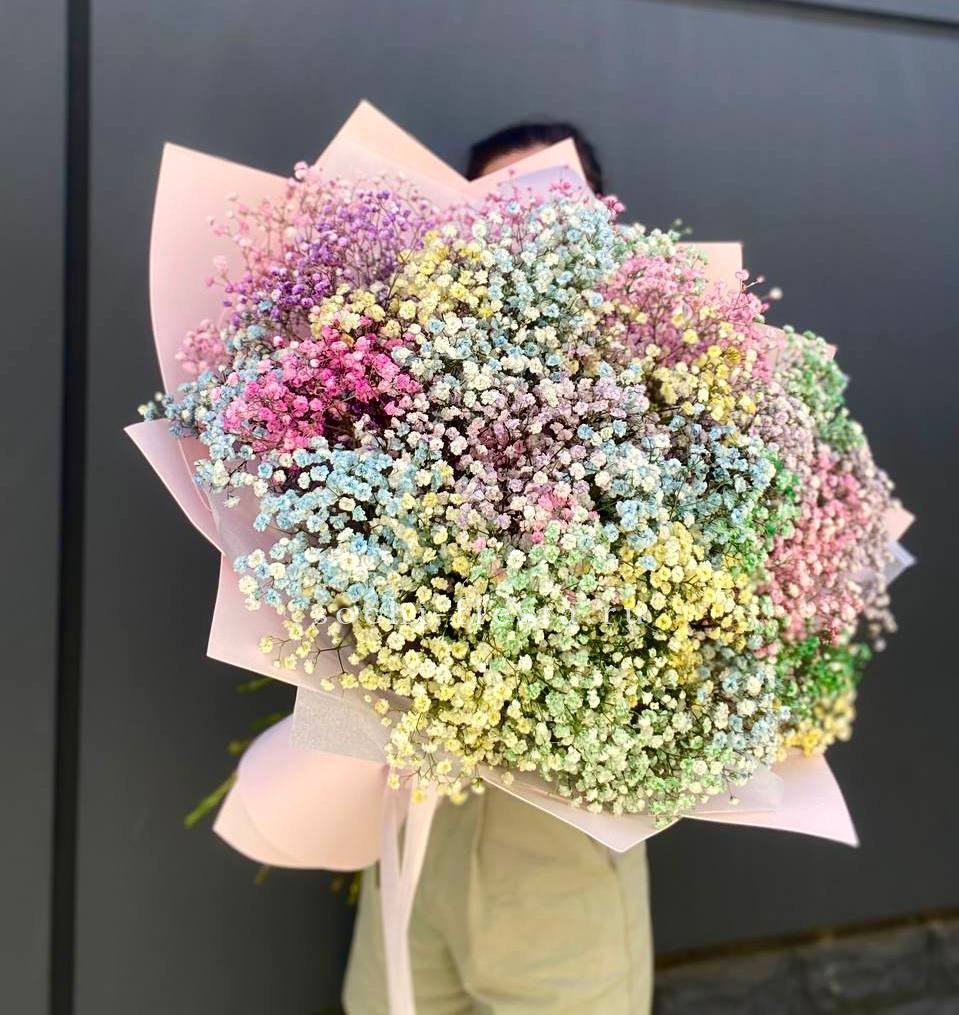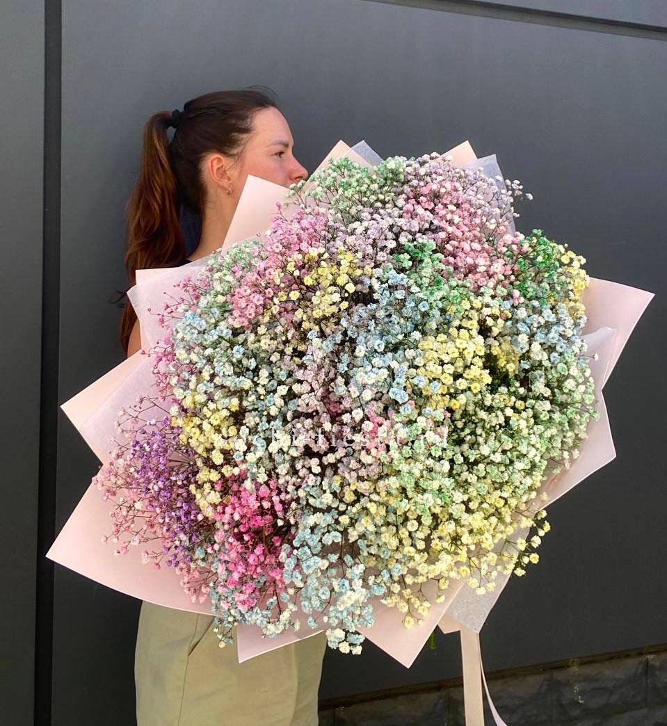 Воздушное облако из мелких соцветий создает объёмную текстуру и мягкий силуэт. Двадцать пять веток гипсофилы собраны в пышную композицию, которая наполняет пространство лёгкостью и свежестью.