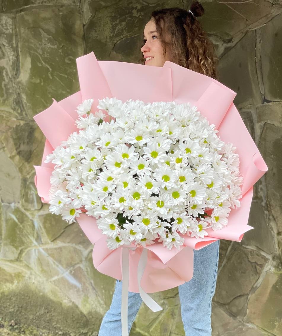 Крупные соцветия одноголовых хризантем раскрываются во всей полноте. Плотные лепестки образуют графичные круги, а сдержанная упаковка сохраняет чистоту формы.