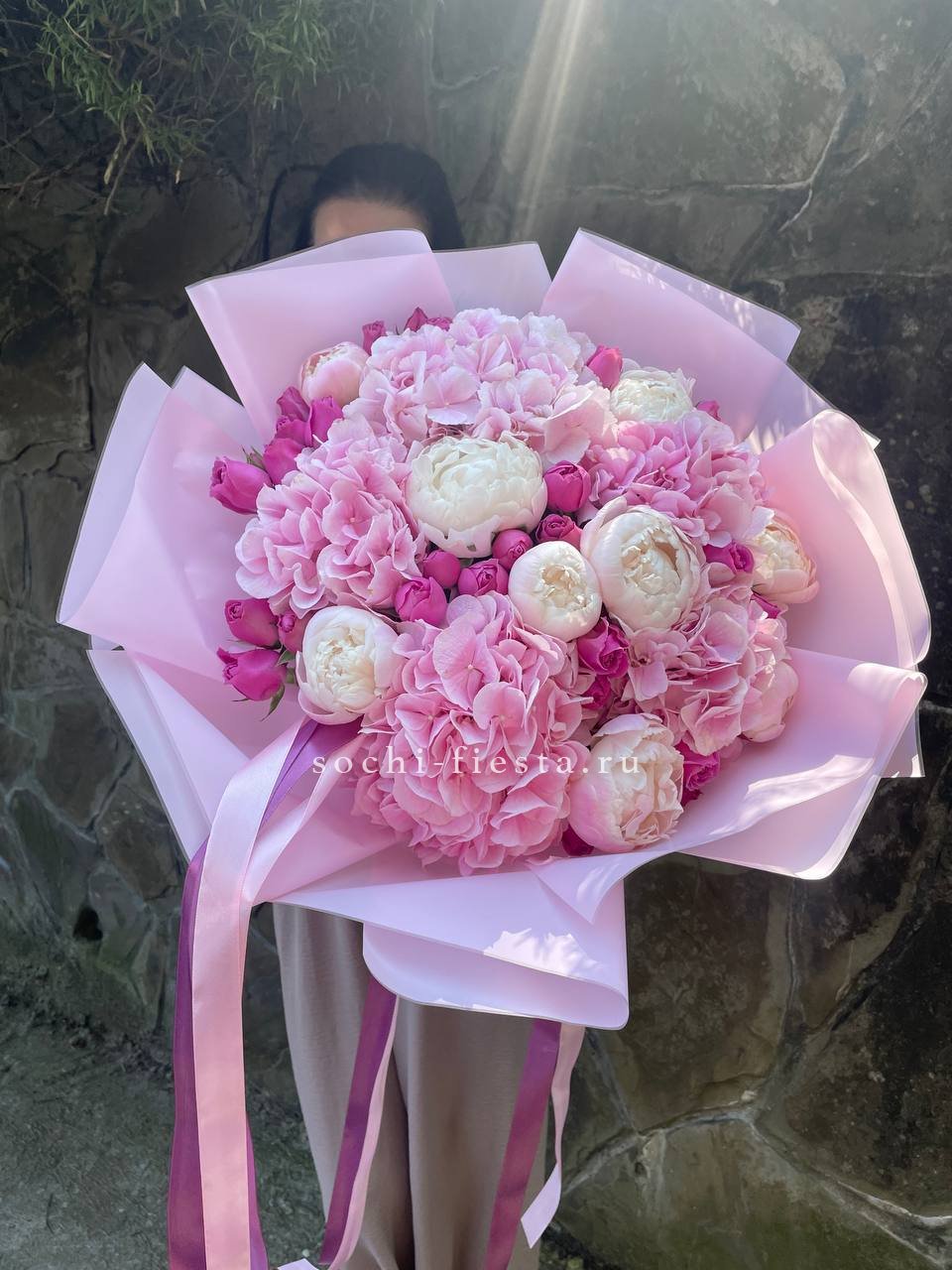 пионовидная роза Мисти Баблс, гортензия, голландские пионы, лента, упаковка.