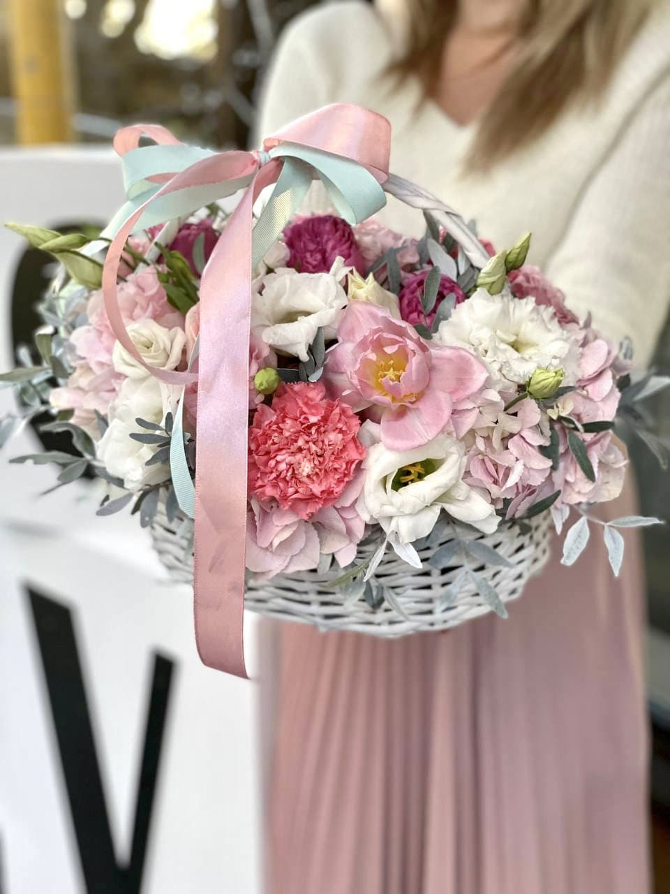 на фото 113 ранункулюсов микс  с эвкалиптом в корзине Вы можете согласовать с менеджером любое количество) Такой объём лучше заказывать за 1.5 недели)