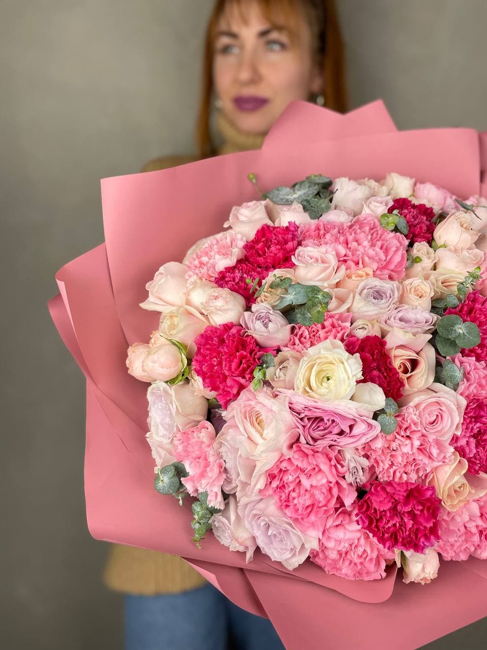 Пионовидные бутоны с волнистыми лепестками соседствуют с графичными диантусами и свежими ветками эвкалипта. Авторская упаковка завершает образ, добавляя композиции современное звучание.