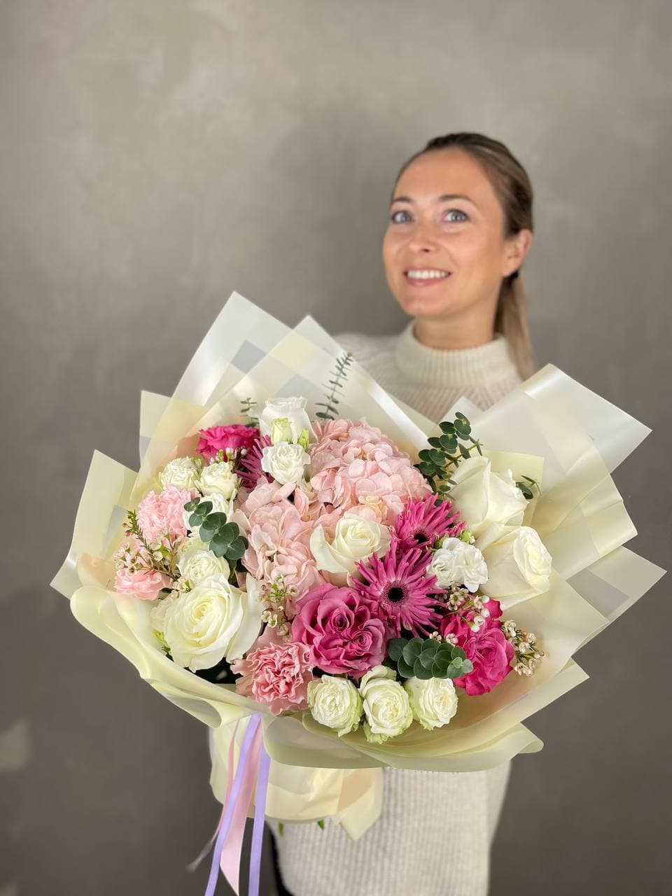 Букет собран вручную с учётом баланса объёма и деталей.