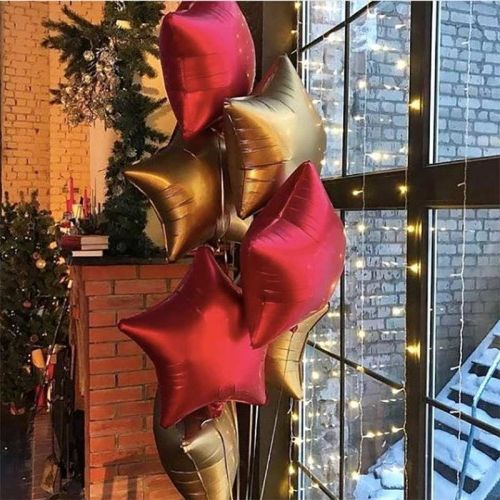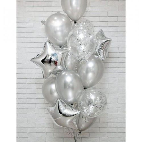 фонтан из 15 гелиевых шаров золотых, серебряных и чёрных оттенков с грузиком. Все шары мы предварительно обрабатываем специальным составом Highfloat, обеспечивая им длительный срок полета.