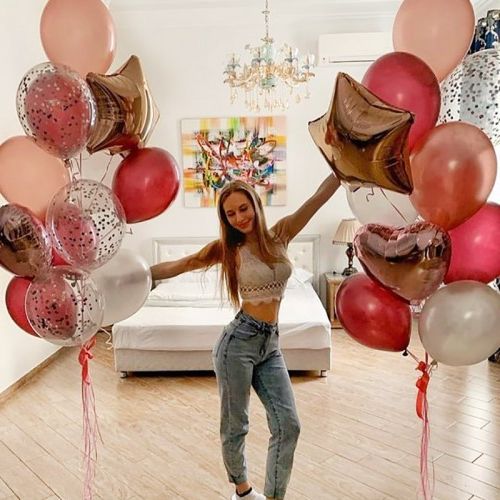 Воздушное облако из девятнадцати шаров создает мягкую цветовую волну от пудрового до молочного. Композиция легко вписывается в пространство и держит форму несколько дней подряд.