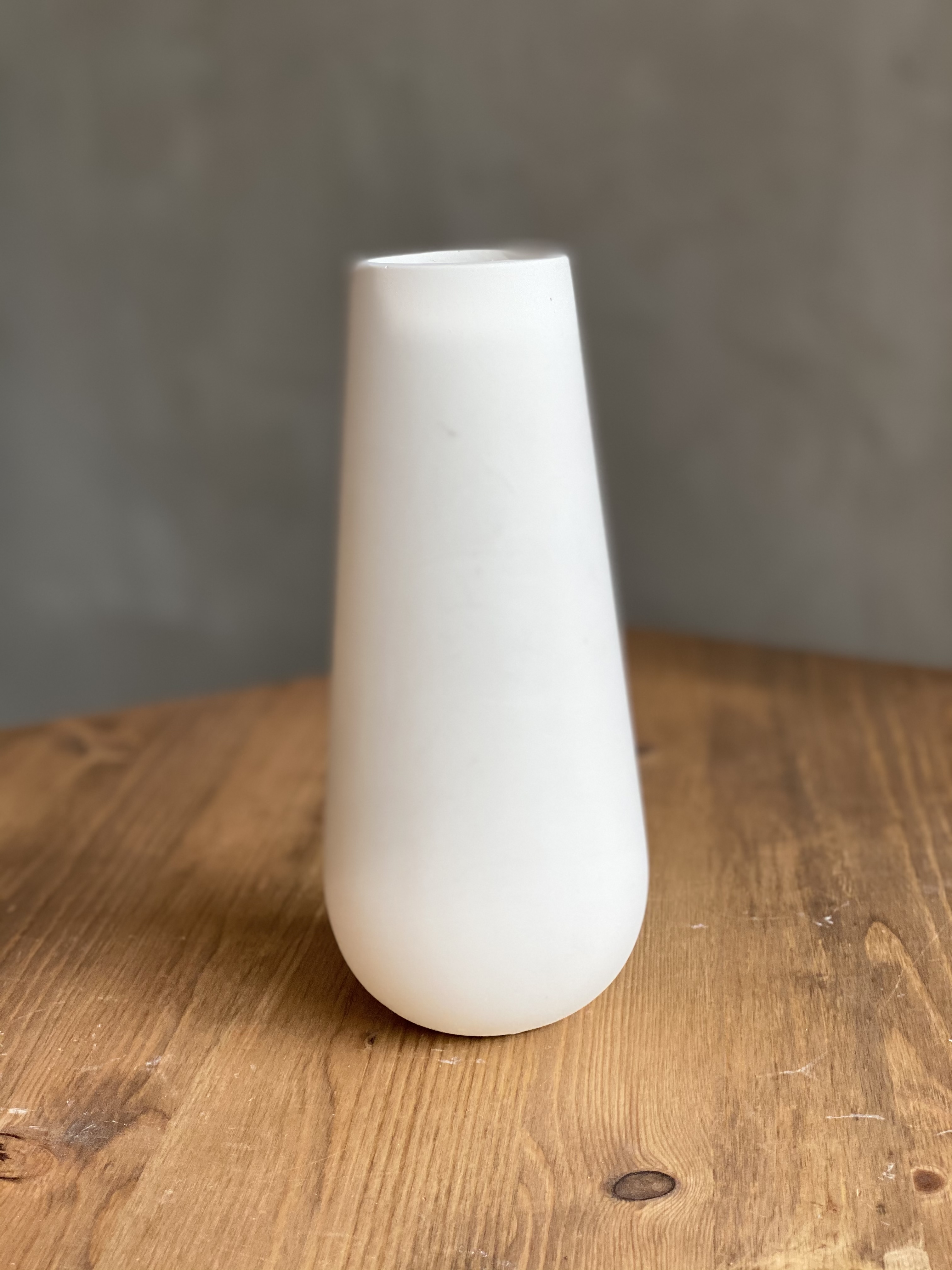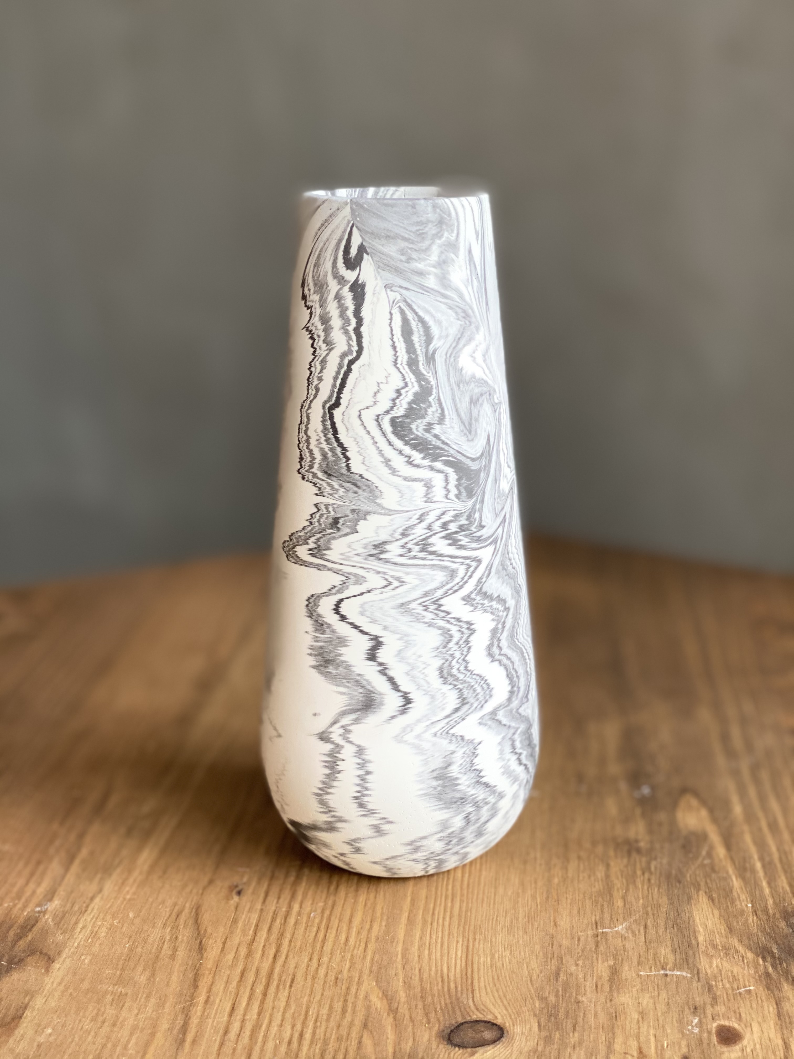 Широкое горлышко позволяет собирать пышные композиции и легко менять воду. Спокойная керамика в серо-белой гамме дополняет пространство без лишних акцентов.