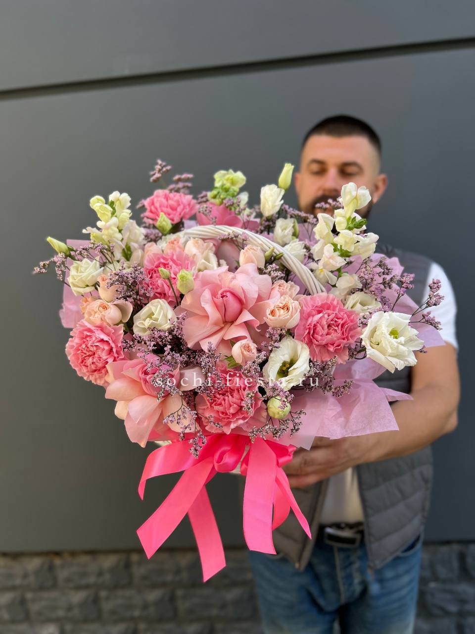 Розовые и алые головки роз собраны в плетёную корзину вместе с воздушной эустомой и серебристым эвкалиптом. Композиция держит форму и легко помещается на столе или комоде.