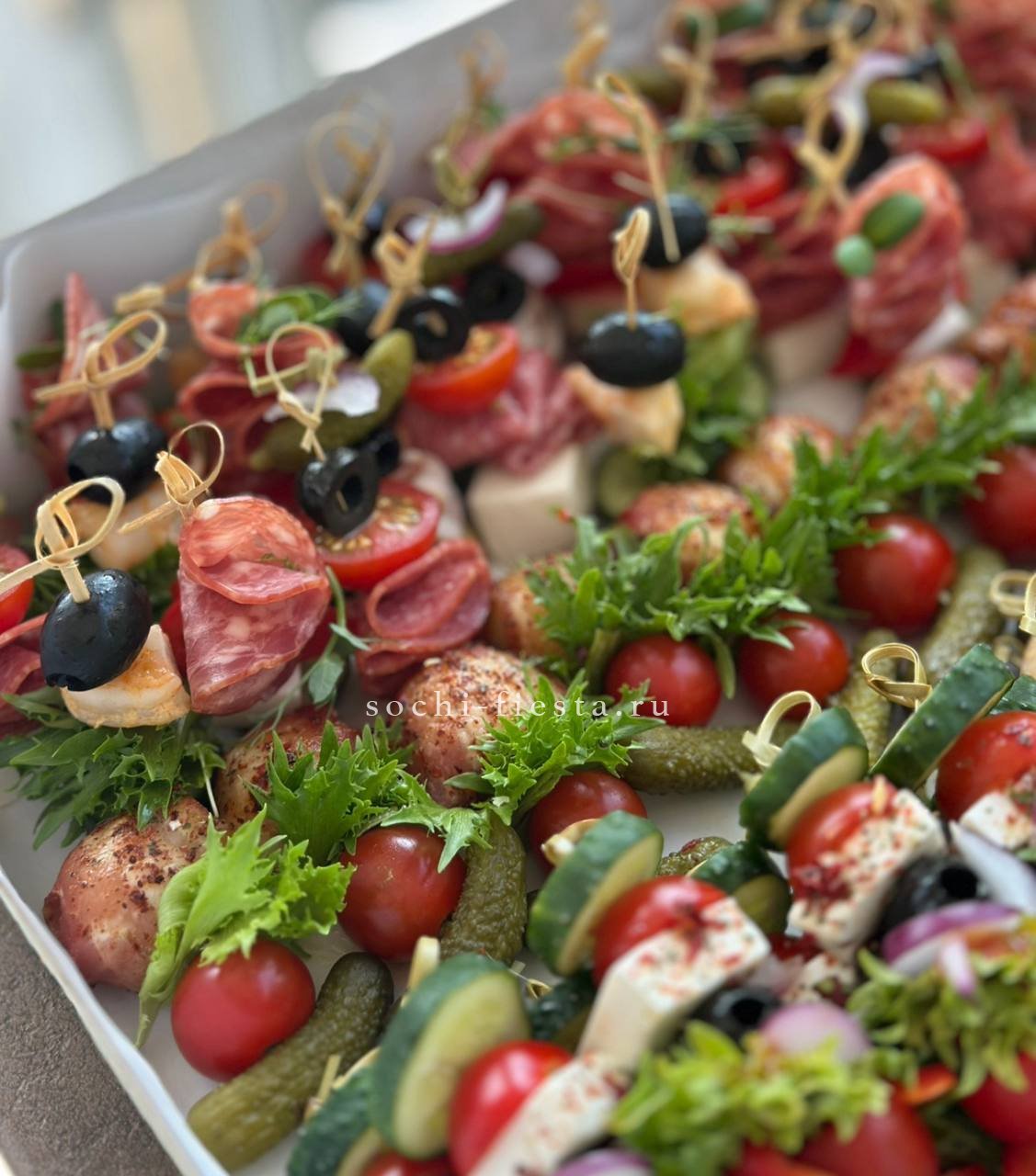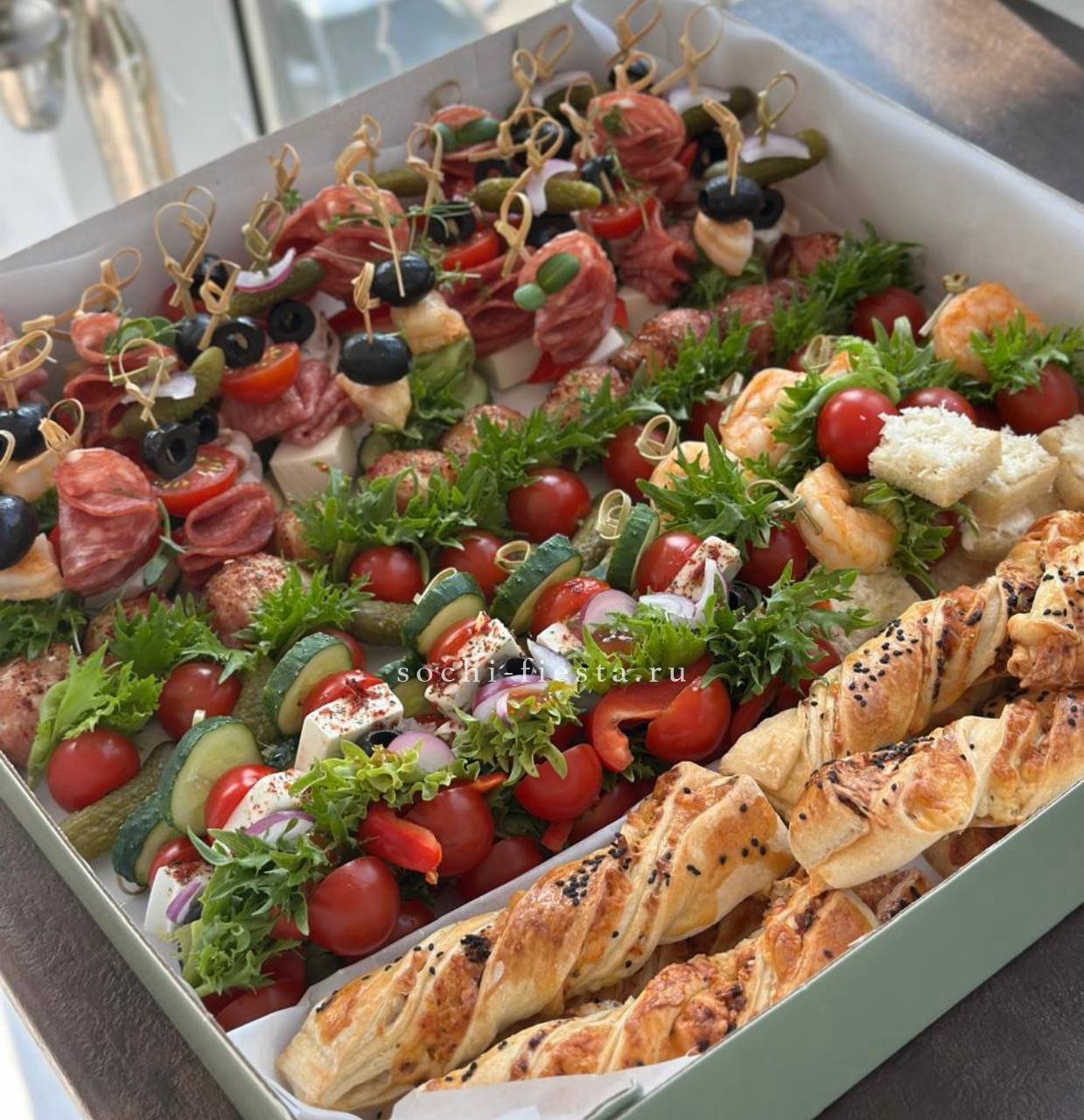 минибургер из свежевыпеченной булочки с кунжутом с куриной котлетой, сыром чеддер, соленым огурцом, свежим томатом, луком и салатом, заправка: авторский томатный соус- 14 шт. Картофельные шарики, подаются в стаканчиках- 4 стаканчика по 5 шт. Куриные нагетсы в кукурузной панировке, в стаканчиках- 4 стакана по 6 шт. Овощная корзинка. Фруктовая корзинка. Соусы красный и белый- 4 шт.