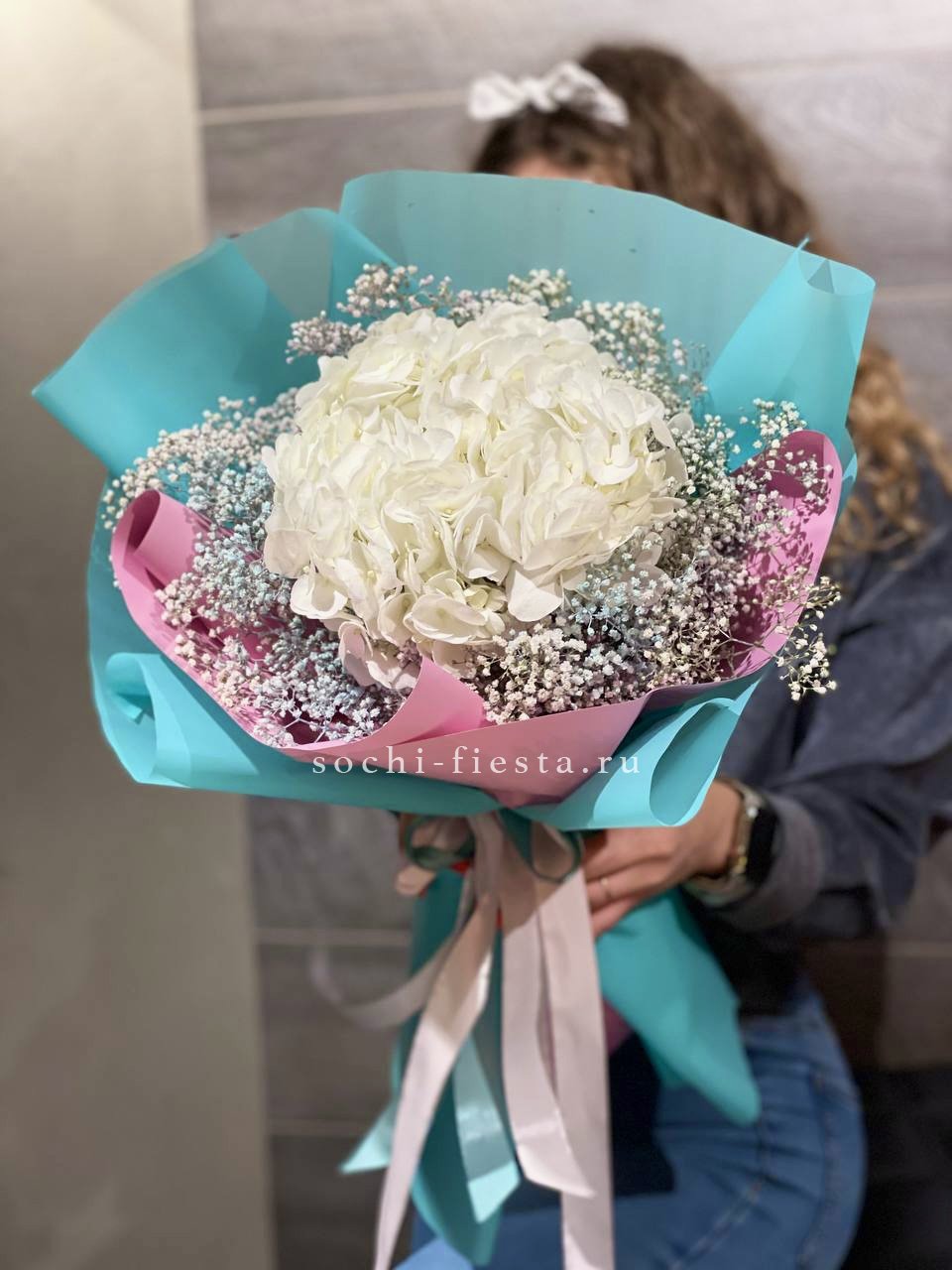 гортензия, гипсофила, лента, дизайнерская упаковка.
