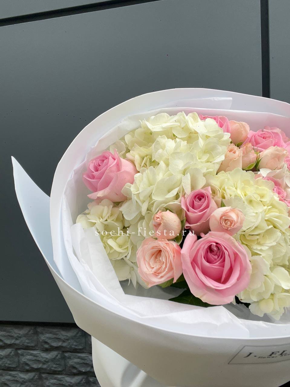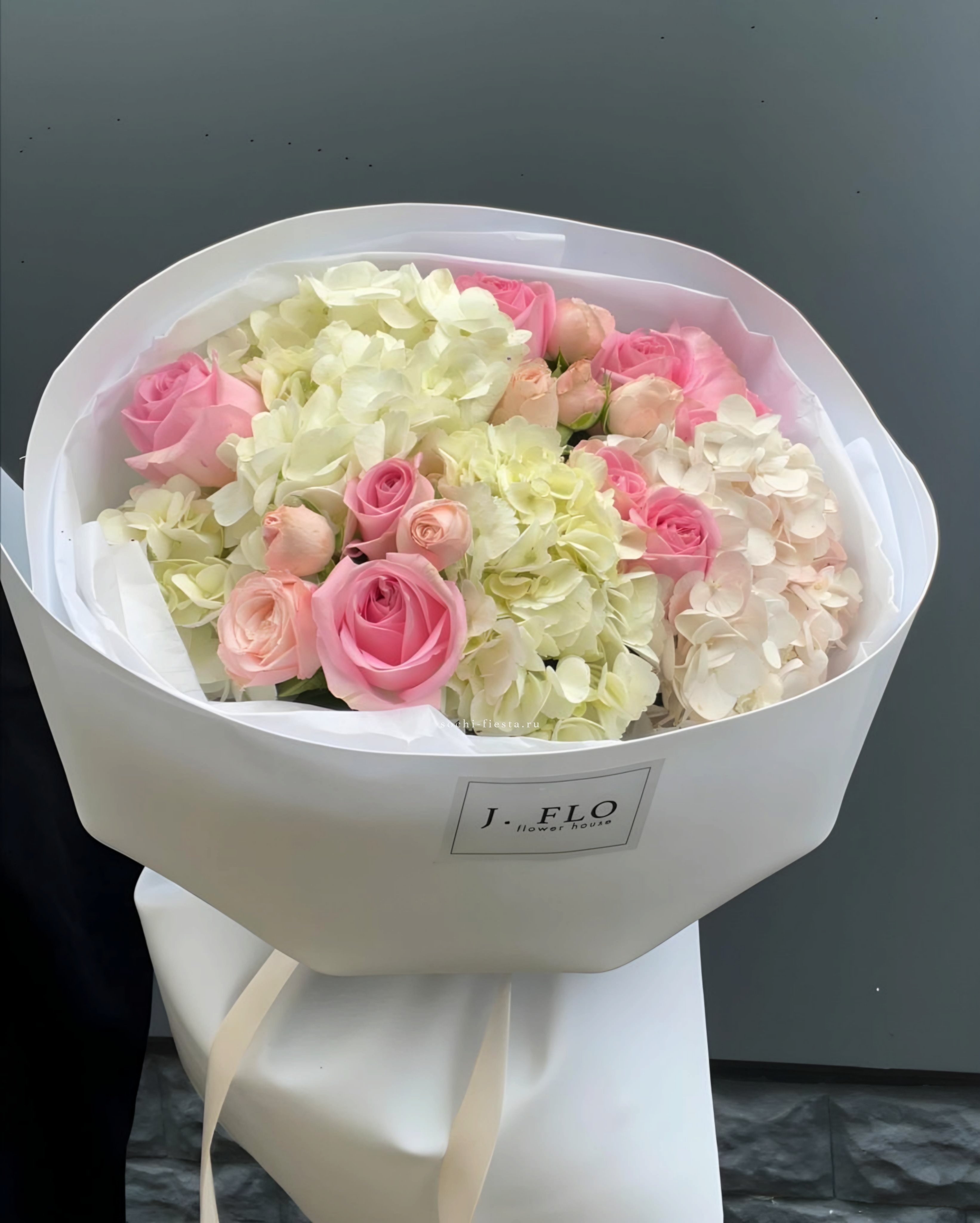 гортензия розовая, лента, дизайнерская упаковка. Цвет гортензий может незначительно отличаться.