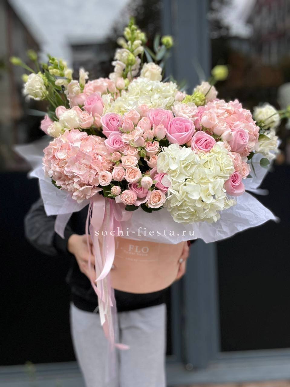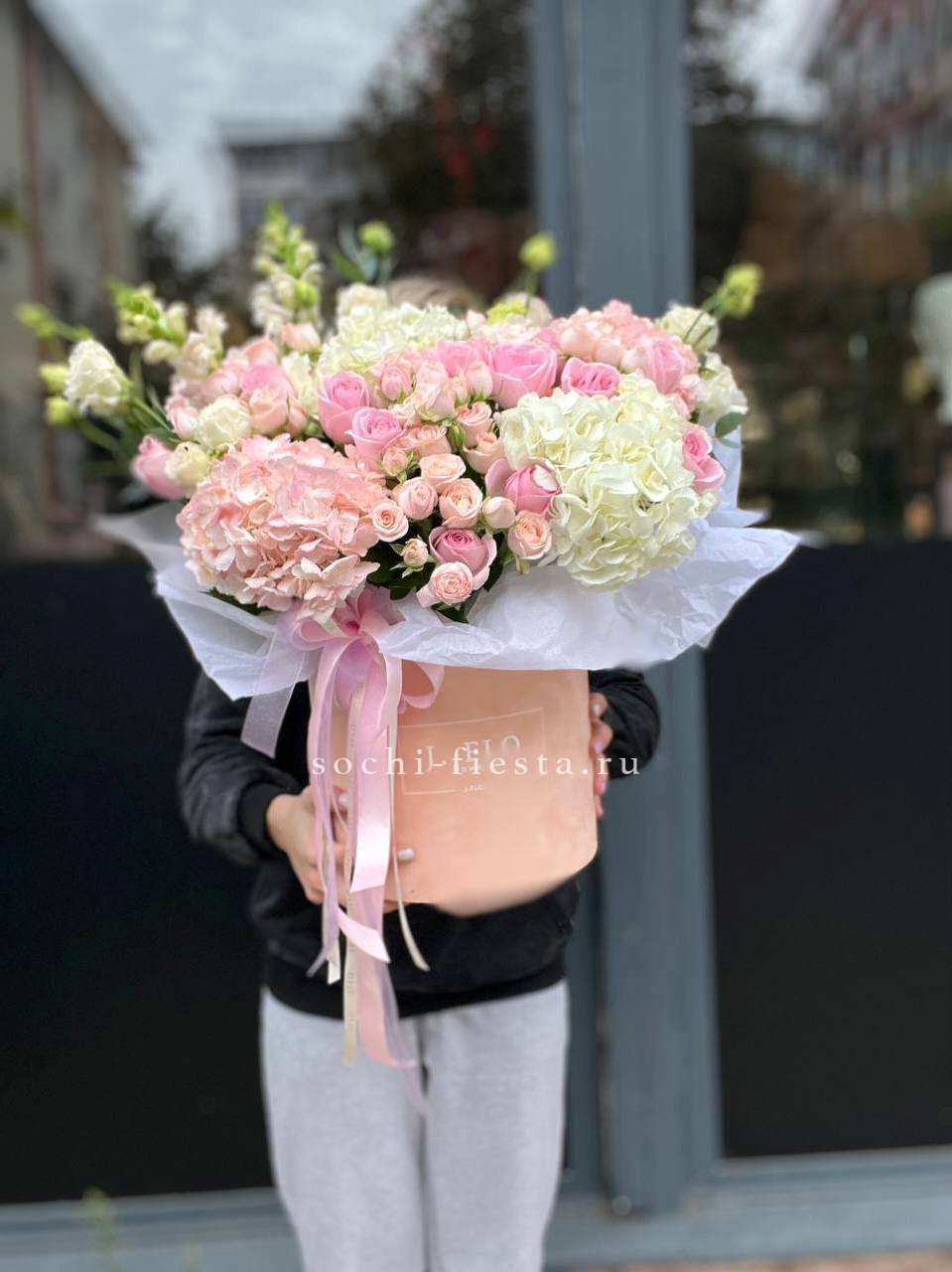 Белые розы и эустомы перекликаются с пастельными соцветиями гортензии, а озотамнус добавляет фактурные акценты. Эвкалипт обрамляет композицию серебристыми нотами.