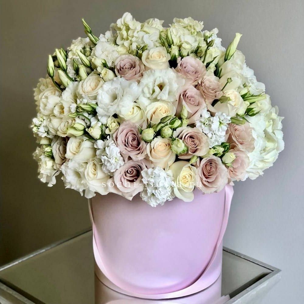 эустома, гортензия, белая роза, диантус, статица, бомбастик, бокс.