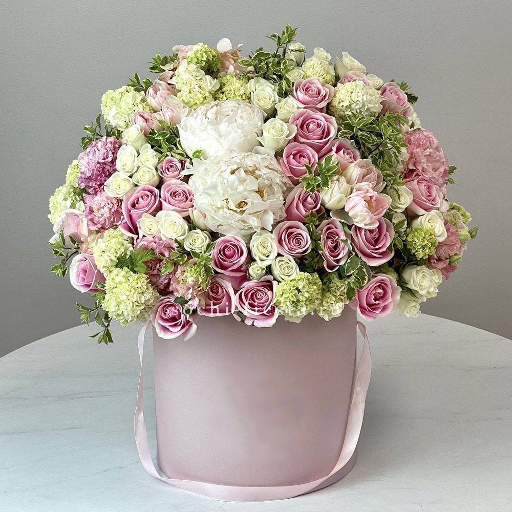 Белоснежные розы и воздушная эустома соседствуют с пышной гортензией и яркими вспышками статицы. Композиция собрана плотно, каждый цветок находит своё место в общем ритме.