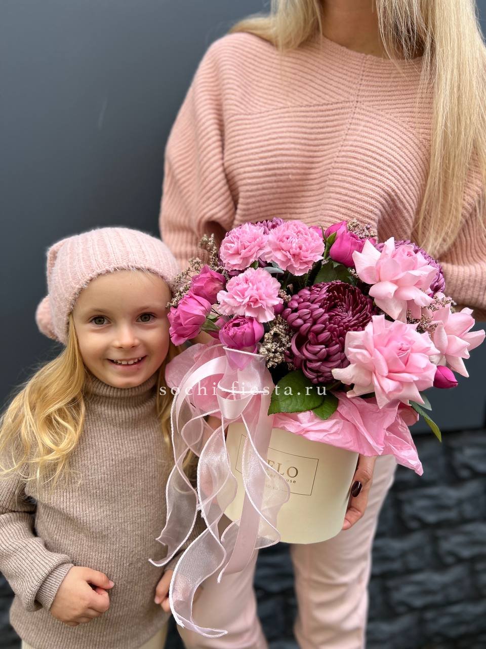 Хризантемы и диантусы задают воздушную текстуру, а мисти бабблс добавляет композиции объем. Лимониум вплетается между бутонами, создавая мягкую игру оттенков.