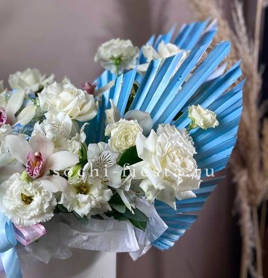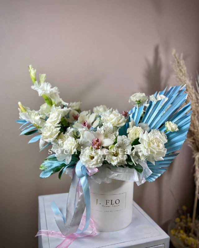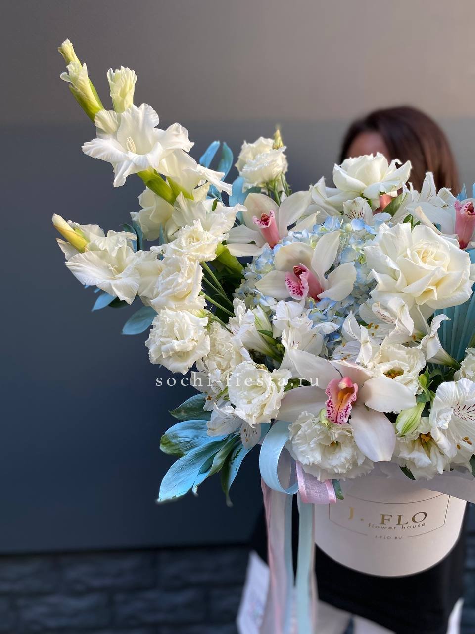 Белоснежные розы и орхидеи встречаются с синими оттенками гортензии, создавая свежую палитру. Гладиолусы задают вертикальный ритм, а альстромерии наполняют композицию деталями.