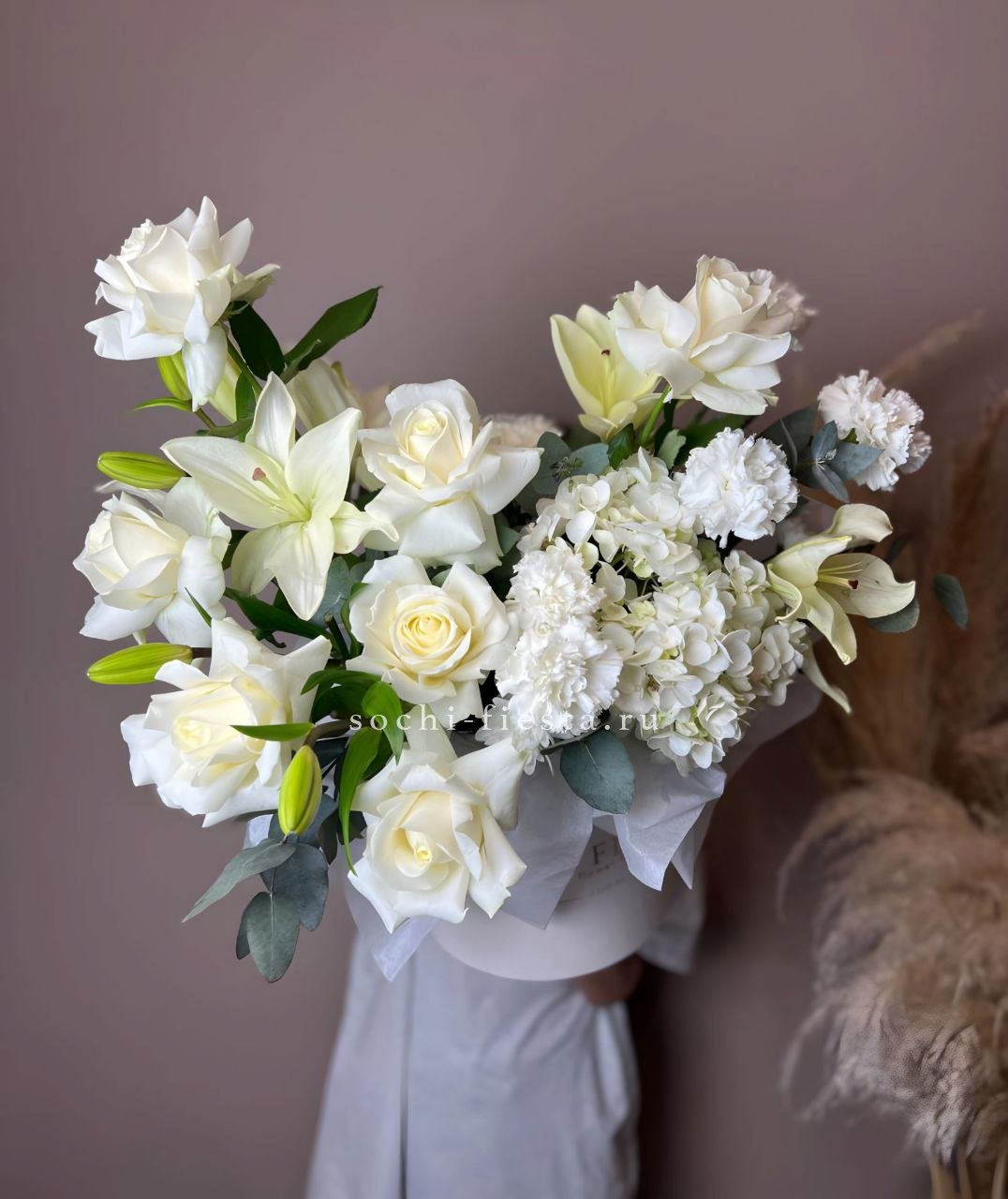 Белоснежная гамма раскрывается через лилии, розы и пышную гортензию с добавлением диантуса. Эвкалипт придает объём и глубину всей композиции в цилиндре.