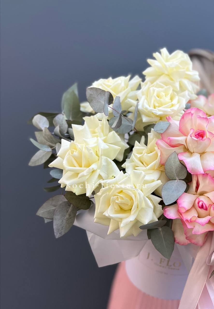 гортензия, кустовые розы, диантус, мисти баблс, эвкалипт, лента, цилиндр D16.