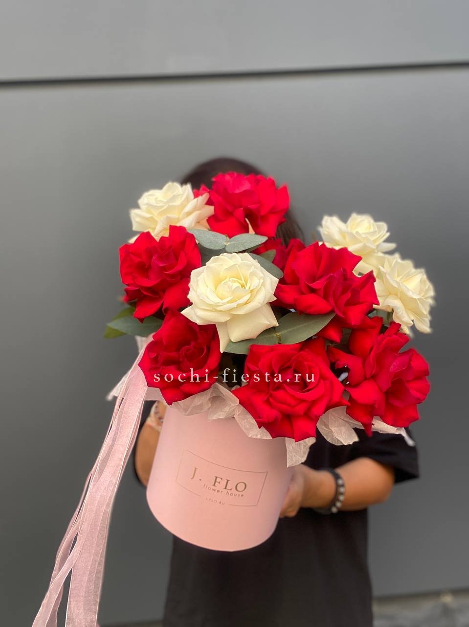 белые розы, красные розы, цилиндр D16,  лента.