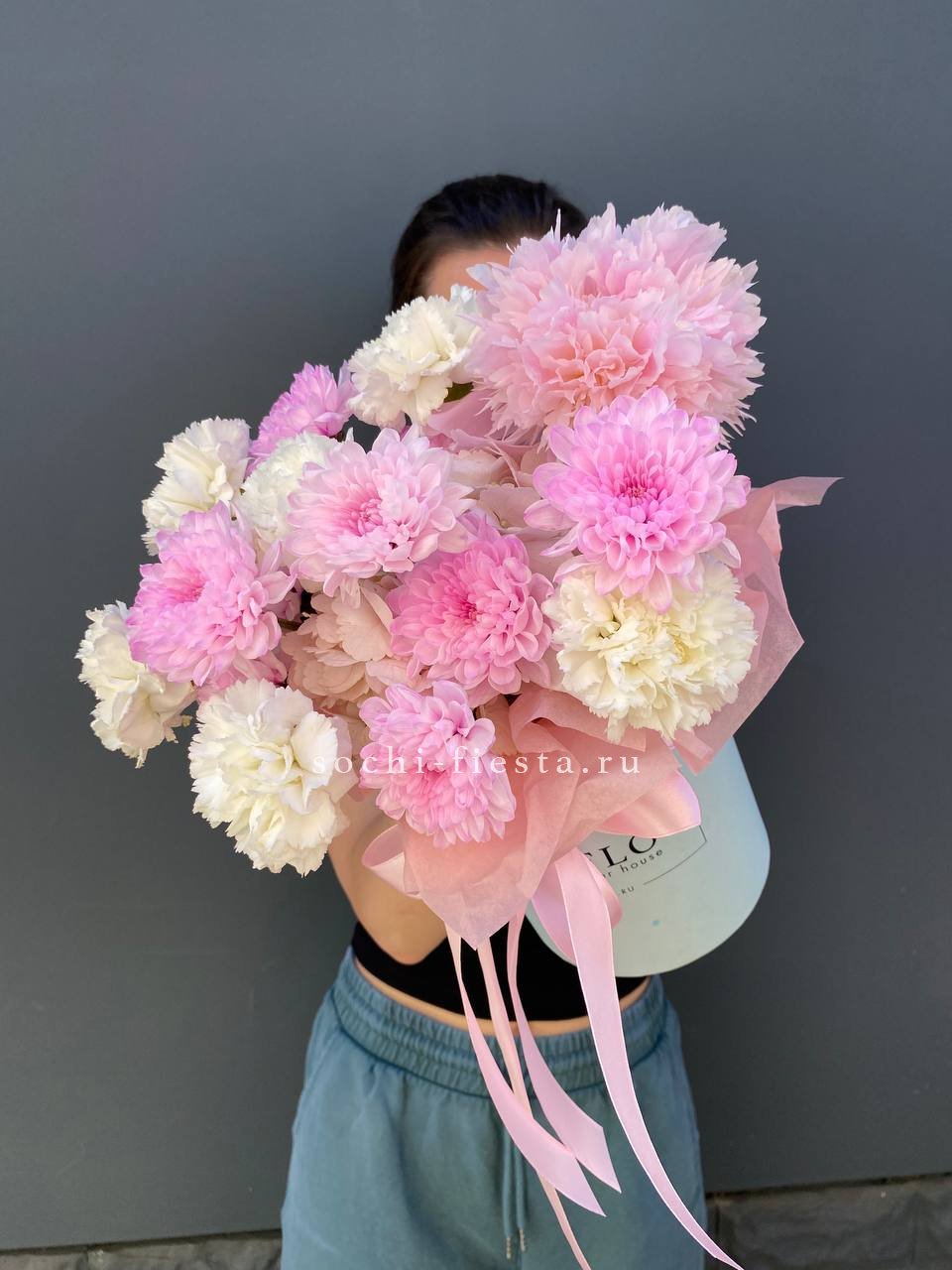 сборный нежный бокс из хризантемы, хлопка, герберы и эустомы.