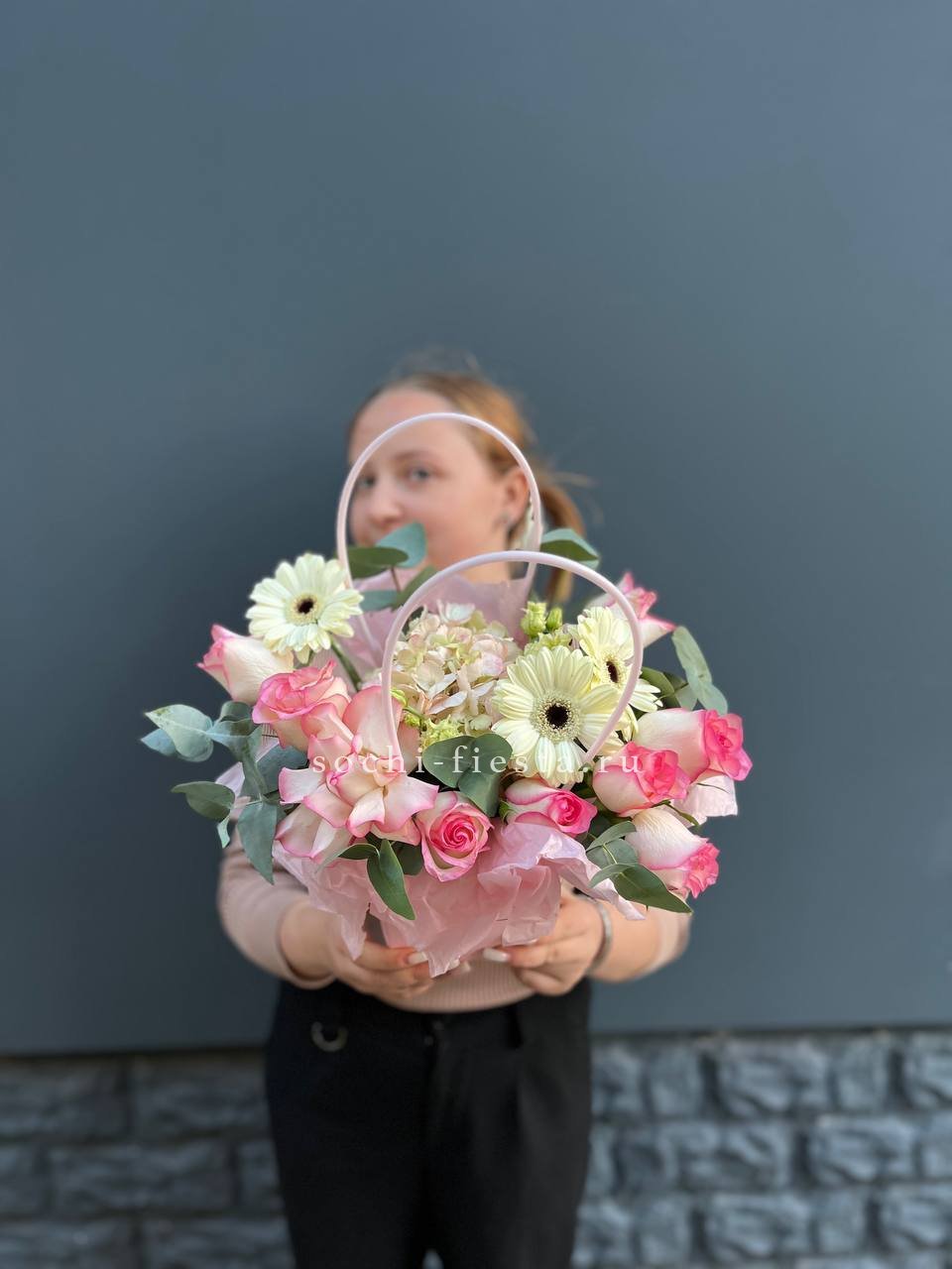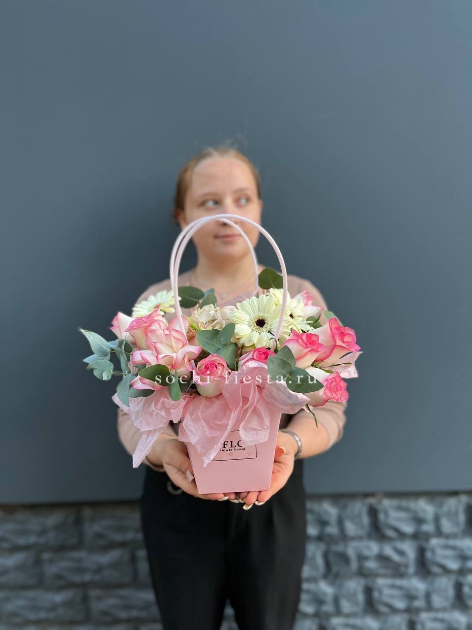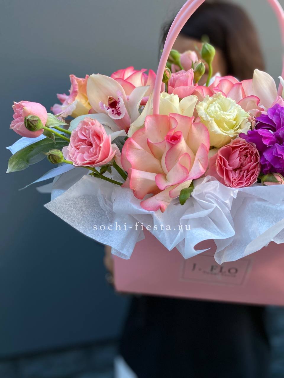 Розовые розы встречаются с орхидеей цимбидиум в объемной сумке-кашпо. Эустома и диантус создают многослойность, а кустовые розы заполняют пространство между крупными бутонами. Композиция держит форму и радует насыщенностью.