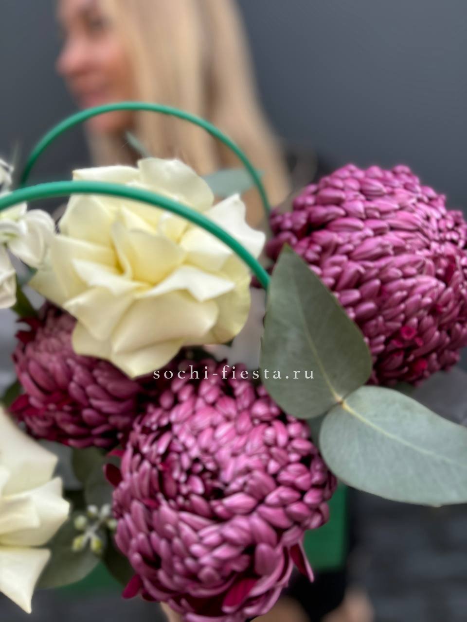 Хризантемы бигуди с их игривой текстурой задают ритм всей композиции. Маттиола добавляет мягкости, а розы завершают образ. Всё это собрано в удобной сумке, готовой к переноске.