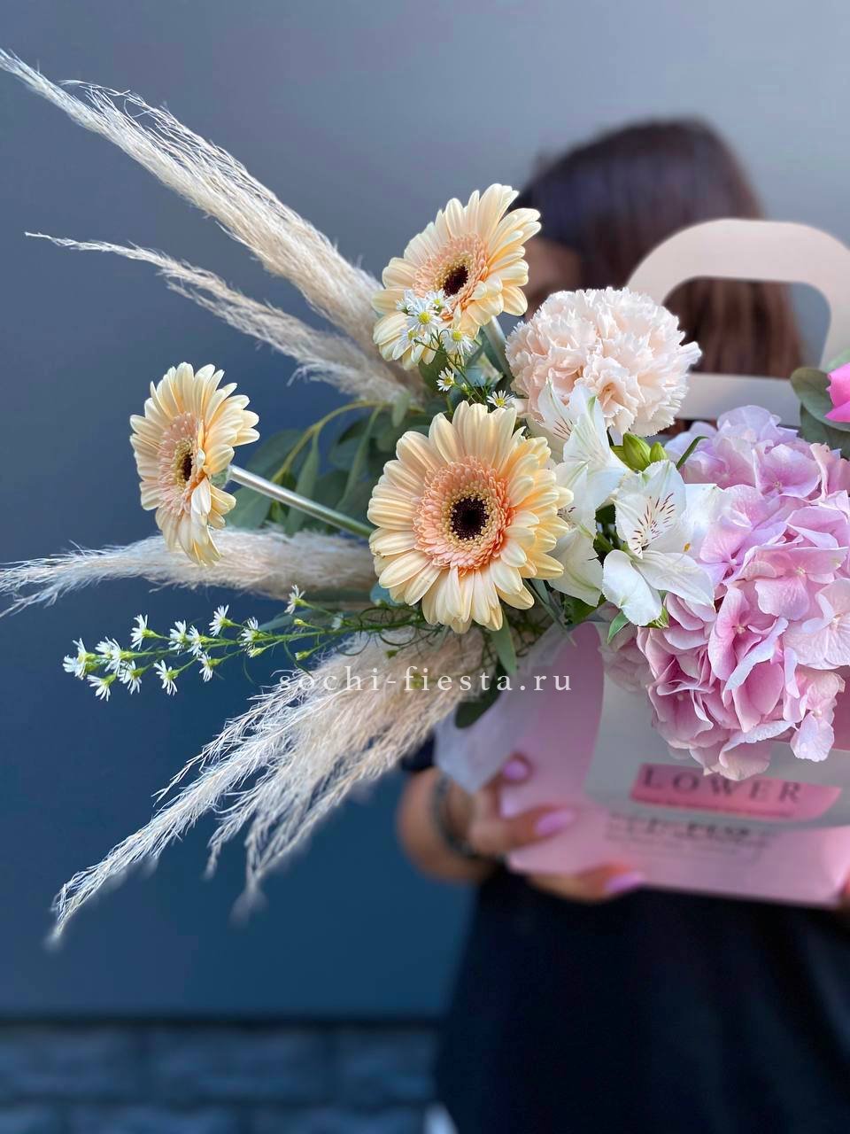 Первый взгляд цепляется за игру фактур: плотные головки гербер соседствуют с воздушными соцветиями мисти баблс и гортензии. Озотамнус добавляет графичные точки между крупными бутонами.