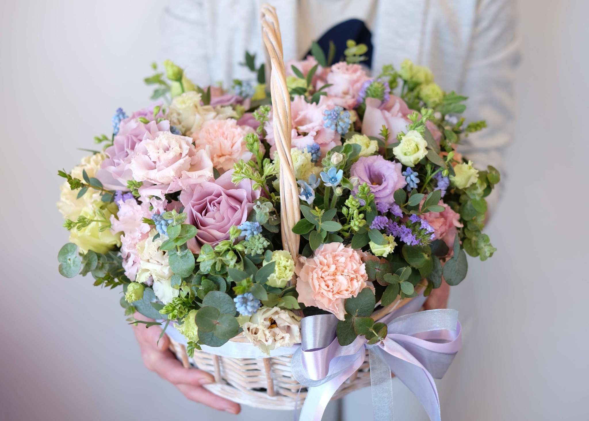 гортензия, эустома, диантус, роза, бомбастик, статица или аналог, корзина.