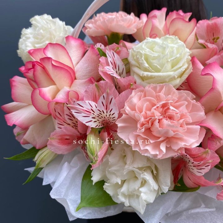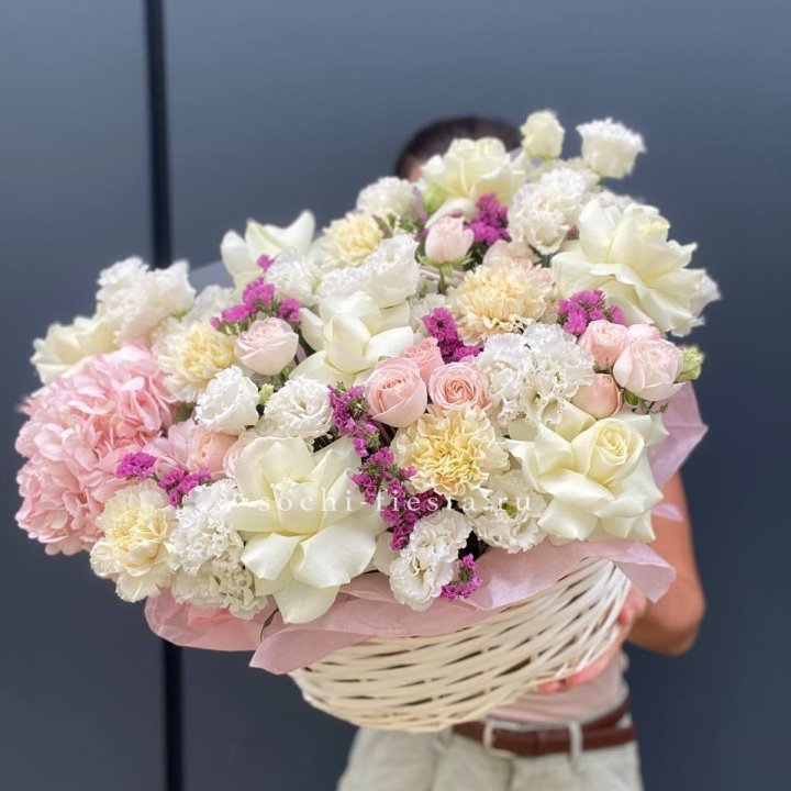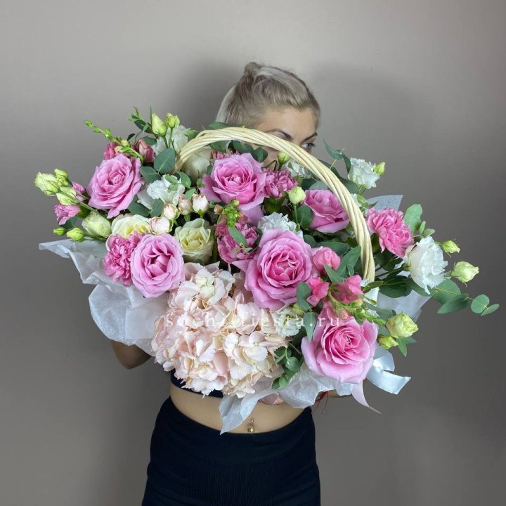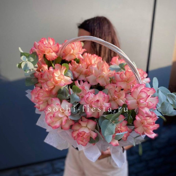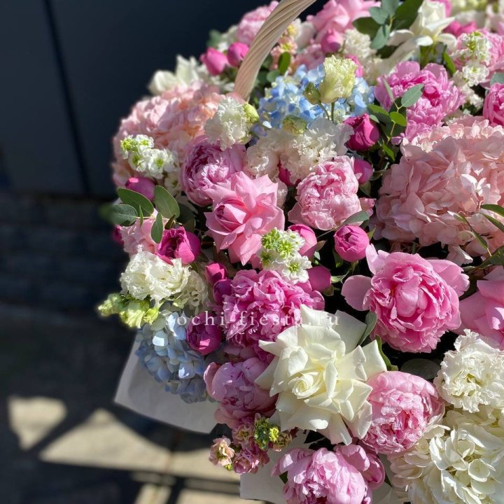 Состав корзин в Абакане определяется текущими поставками и сезоном. Розы Freedom, Mondial, Cappuccino — для классических куполообразных аранжировок. Пионы в мае-июне из свежих поставок: Sarah Bernhardt, Red Charm, Bowl of Cream — главный сезонный продукт. Хризантема, альстромерия, гербера — для объёмных торжественных наполнений. Эустома, ранункули — для садовых корзин. Флорист строит состав под конкретный запрос.