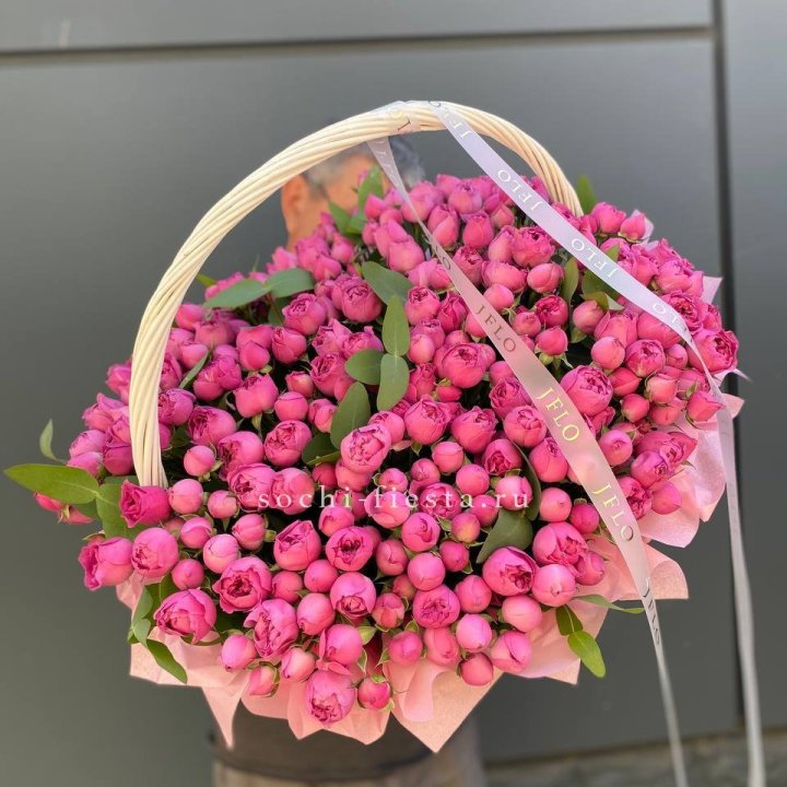 торжественная именинная цветочная корзина с розами куполом для поздравления в российском городе