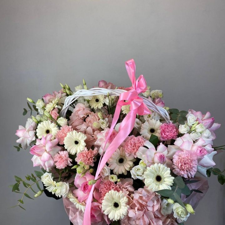 корпоративная цветочная корзина в нейтральной деловой гамме с фирменной лентой для поздравления партнёров садовая цветочная корзина с ранункулями эустомой и эвкалиптом в свободной аранжировке от флориста