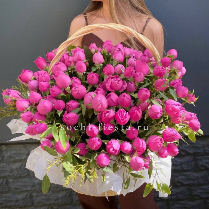 Каждый сезон приносит в Абакане свой ассортимент корзин. Весной флорист создаёт корзины с тюльпанами и нарциссами — лёгкие, нежные, полные ощущения обновления. В мае-июне приходят пионы — Sarah Bernhardt, Bowl of Cream, Red Charm — главный флористический праздник. Осенью — хризантема в тёплых гаммах с декоративными ягодами и ветвями. Зимой — хвойные аранжировки с амариллисом для праздничной атмосферы.