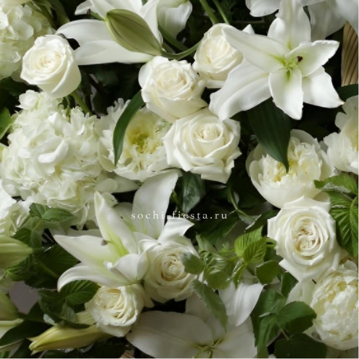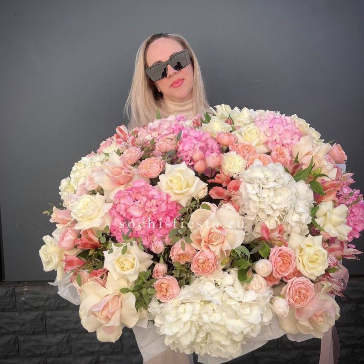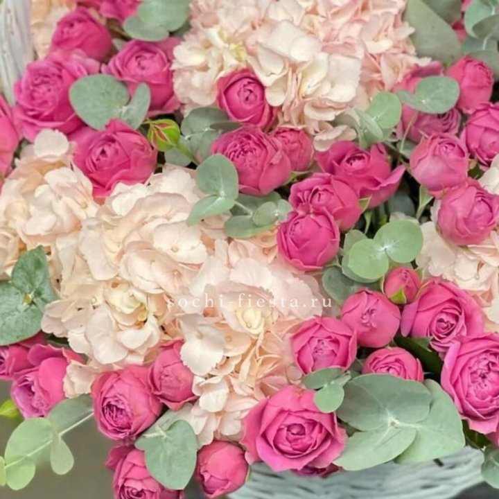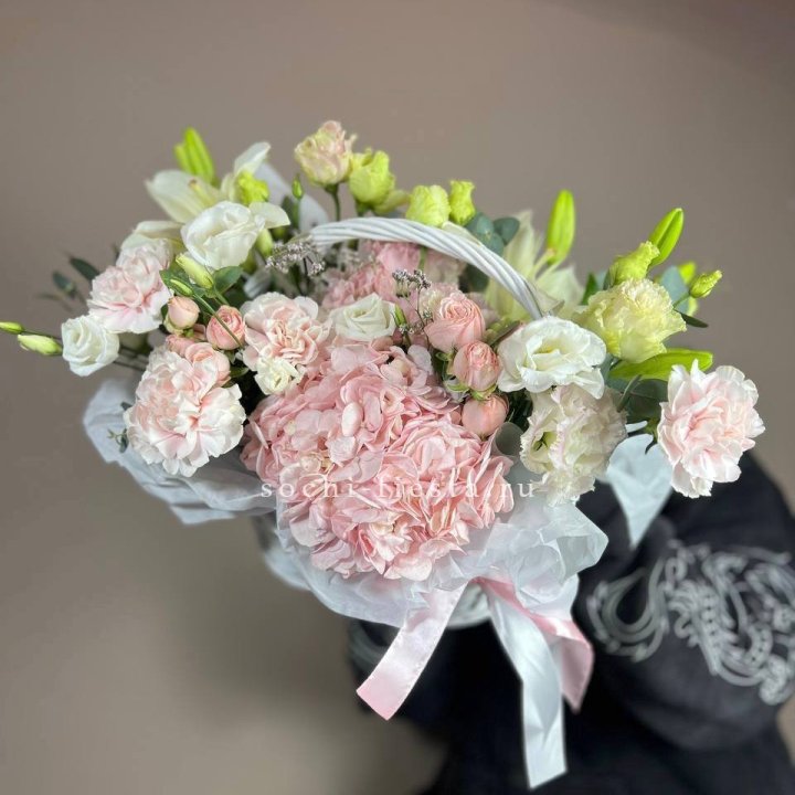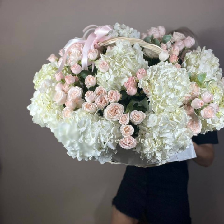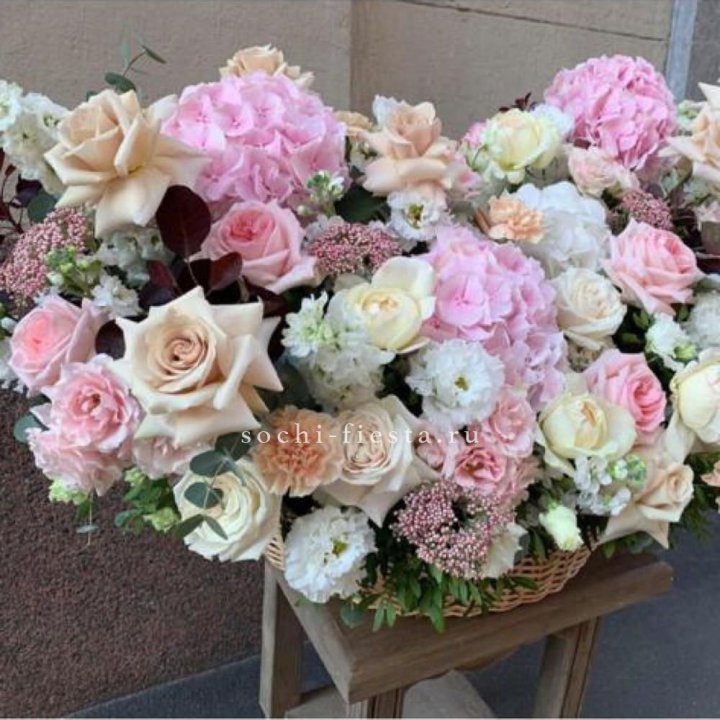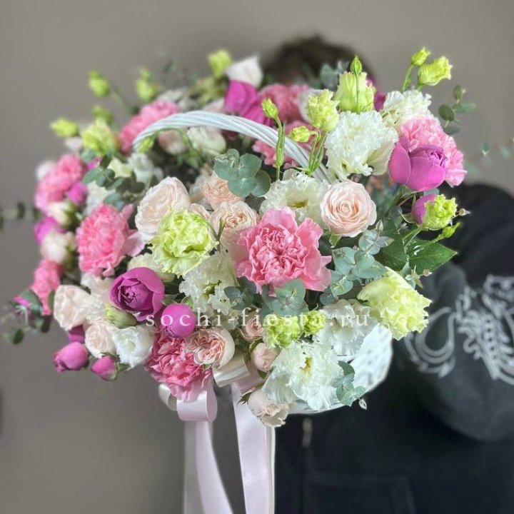 Состав корзин в Абакане определяется текущими поставками и сезоном. Розы Freedom, Mondial, Cappuccino — для классических куполообразных аранжировок. Пионы в мае-июне из свежих поставок: Sarah Bernhardt, Red Charm, Bowl of Cream — главный сезонный продукт. Хризантема, альстромерия, гербера — для объёмных торжественных наполнений. Эустома, ранункули — для садовых корзин. Флорист строит состав под конкретный запрос.