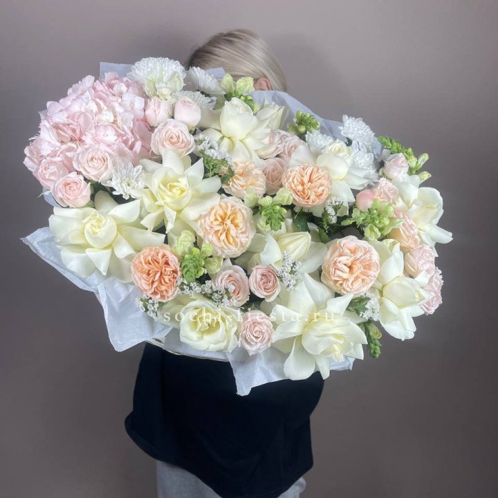 Каждый сезон приносит в Абакане свой ассортимент корзин. Весной флорист создаёт корзины с тюльпанами и нарциссами — лёгкие, нежные, полные ощущения обновления. В мае-июне приходят пионы — Sarah Bernhardt, Bowl of Cream, Red Charm — главный флористический праздник. Осенью — хризантема в тёплых гаммах с декоративными ягодами и ветвями. Зимой — хвойные аранжировки с амариллисом для праздничной атмосферы.