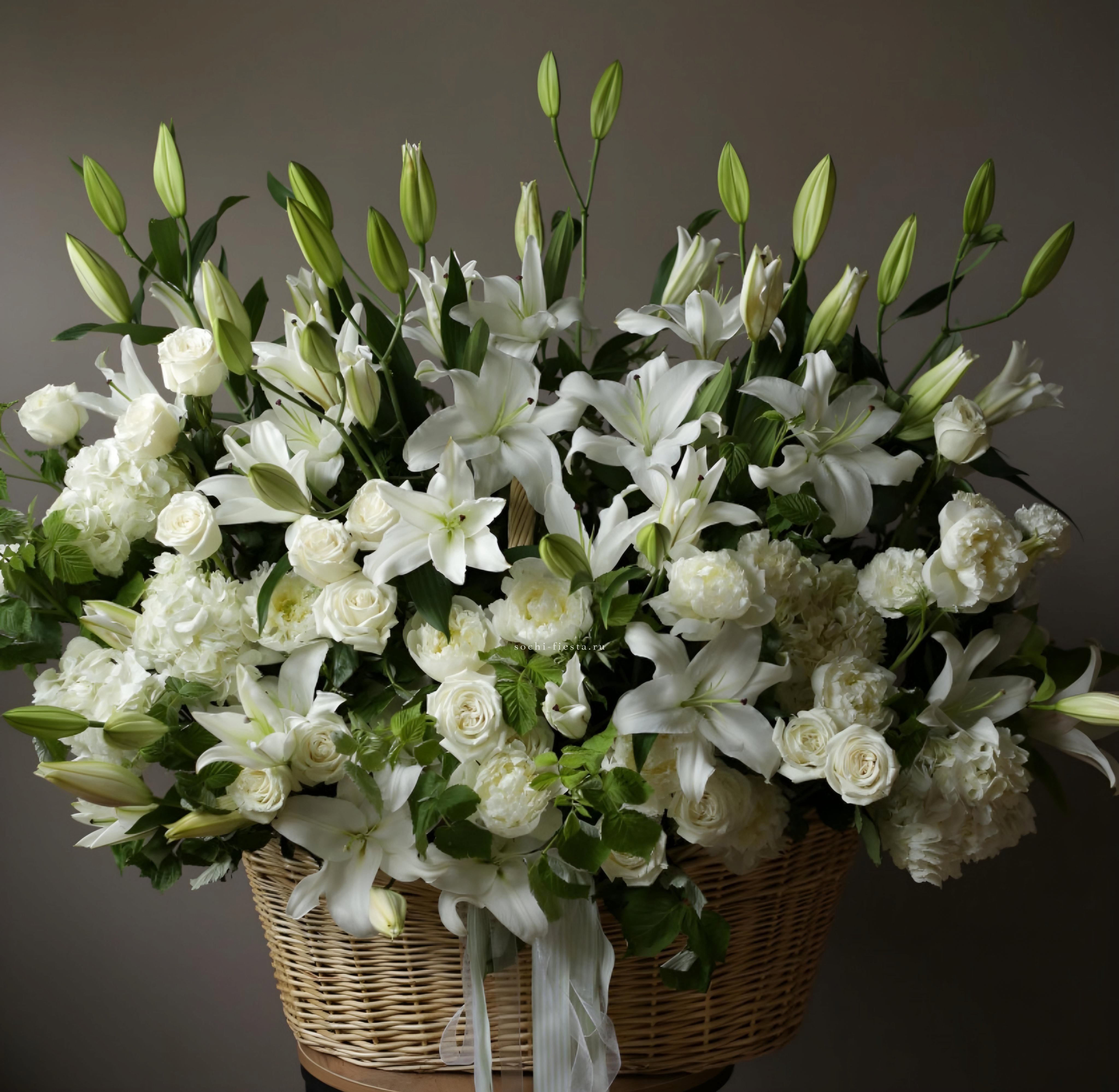 Восемь видов цветов складываются в harmonичную композицию со светлой корзиной в основе. Диантусы и эустома перекликаются с розами, а гортензия задает мягкий объем всей структуре.