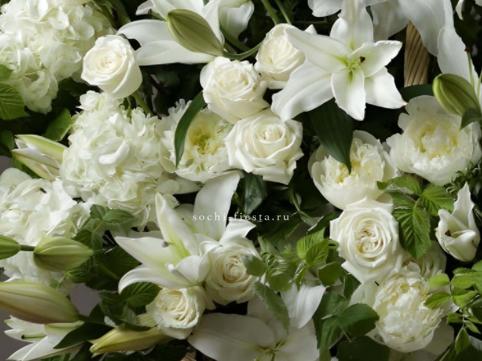 кустовые розы, одноголовые розы, диантусы,  гортензия, эустома, антиринум, озатамус, хризантема, герберы, лента, светлая корзина.Состав может меняться в зависимости от сезонности.
